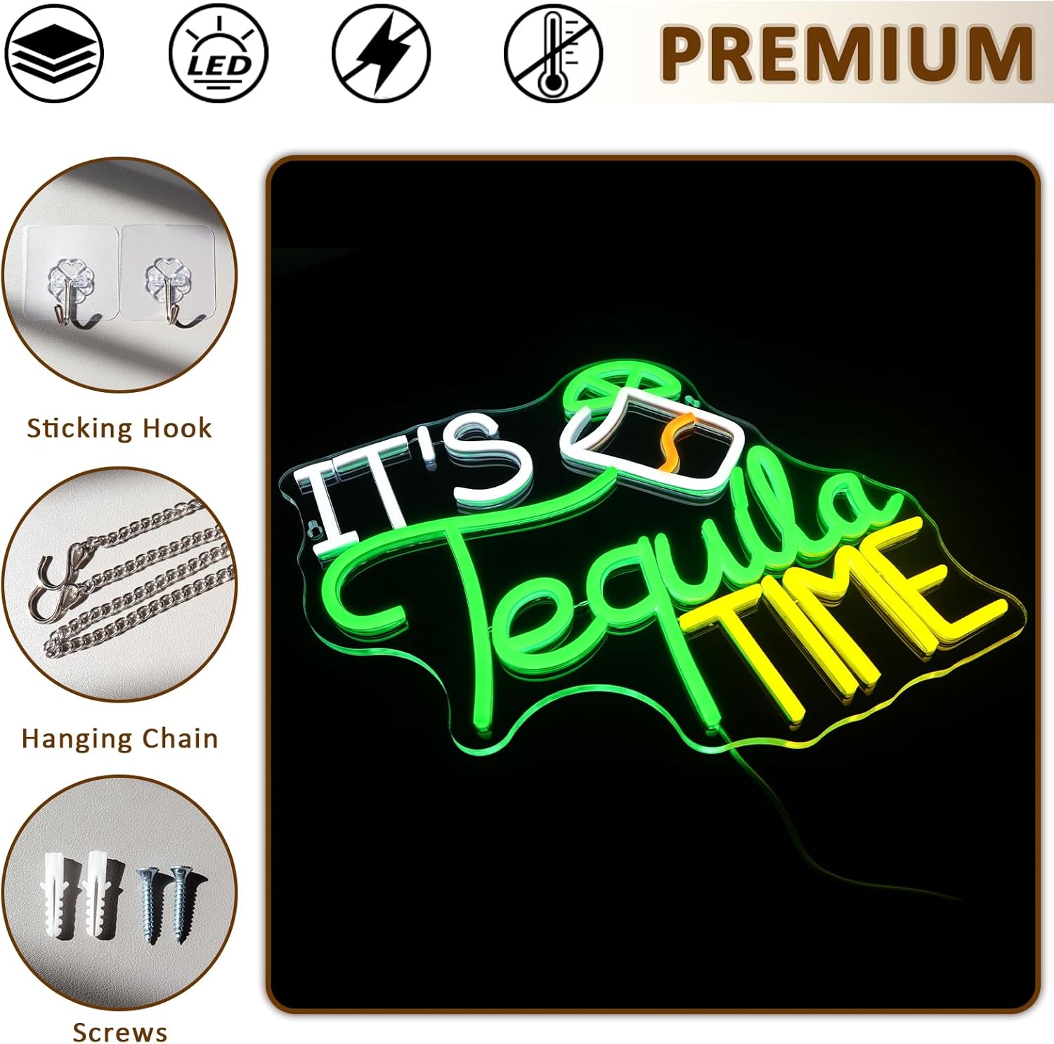 - Easy to Install: Tequila Time Neon light has two pre-drill holes into the high quality transparent backplane so you can install or move it easily. The neon sign comes with chains, screws and a hanging hook for hanging it where you want