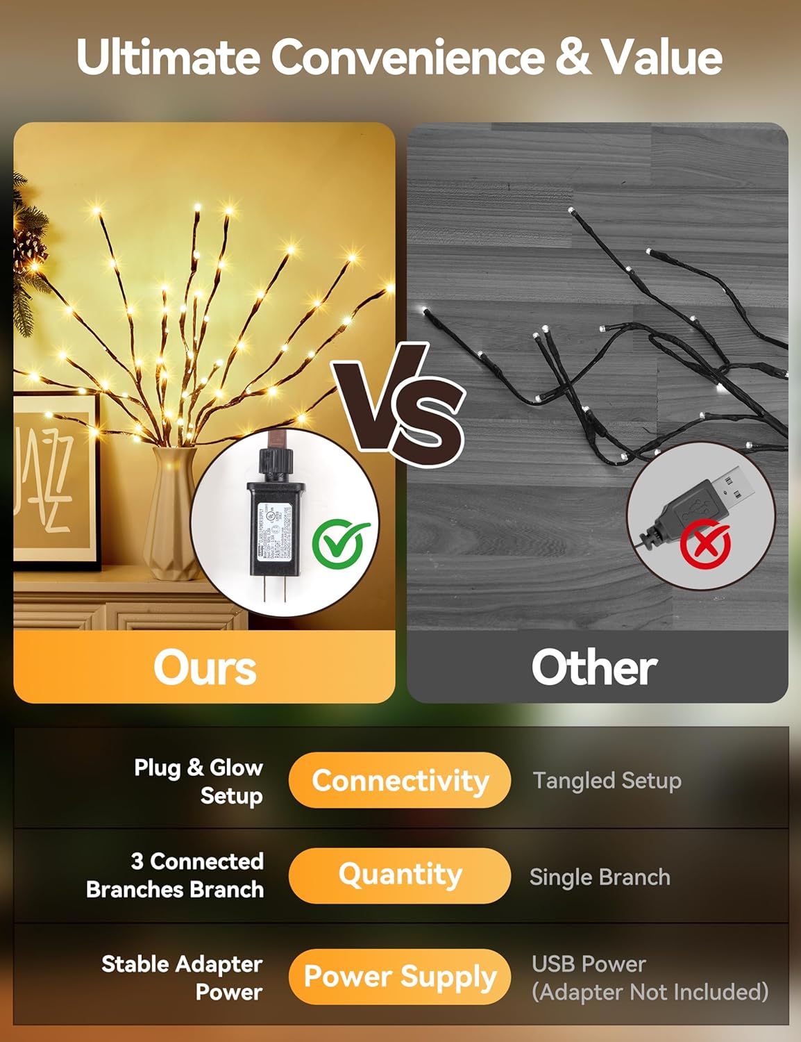 - 【Spectacular appling】Amazing led twig string lights decorations for home, bookcase, dinning table, feast, lawn, garden, patio, balcony, porch, corridor, hallway, fence, bistro, bar, pub, cafe, supermarket, shopping mall, shop windows, supermarket, party, birthday, valentine’s day, mother’s day, showroom, wedding, office, studio, hotel, museum. Note: The ac plug is not waterproof, it should be protected in rainy day