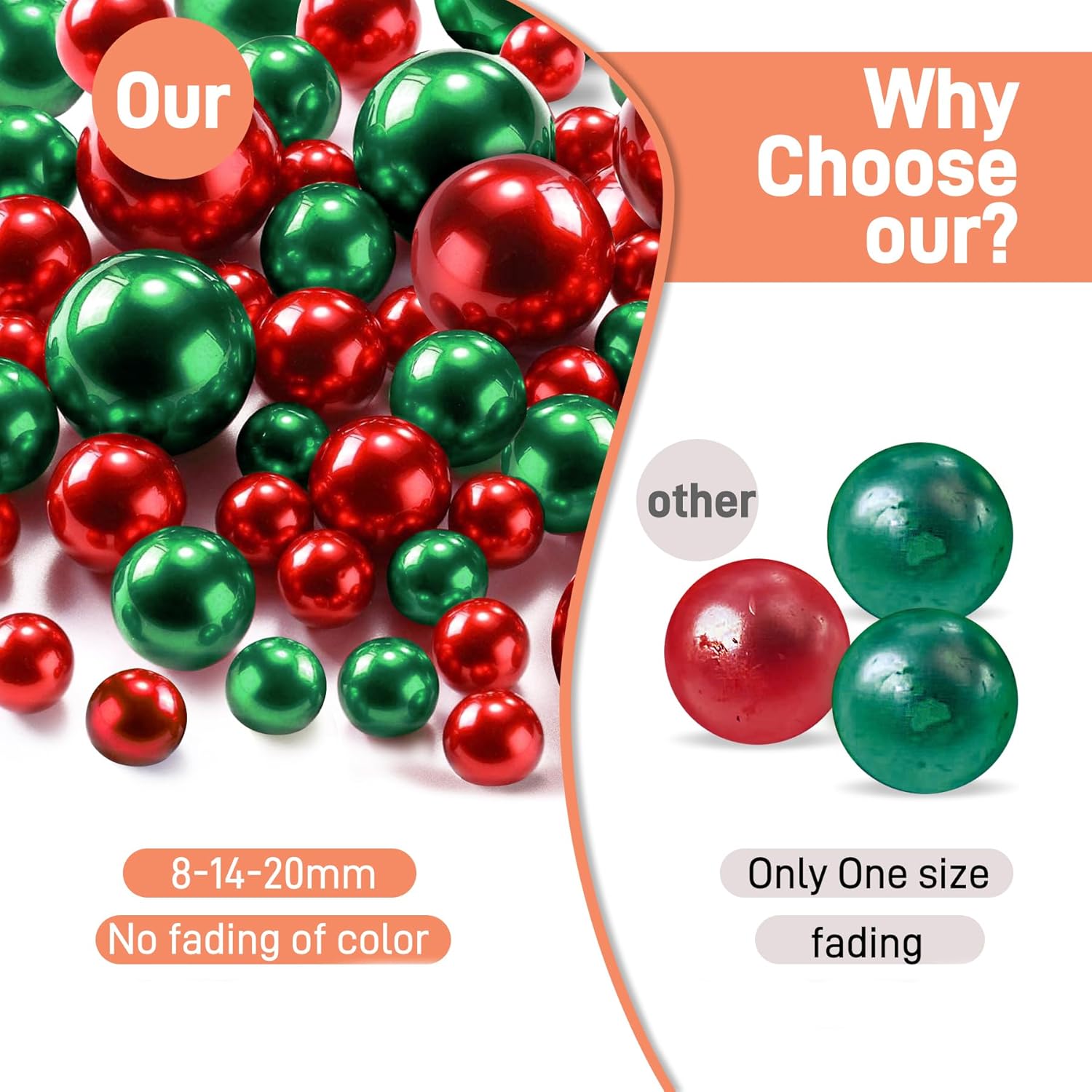 180PCS Red & Green Beads for Centerpieces Vases, No Hole Polished Pearl Makeup Beads Mixed 8/14/20mm Sizes, Pearl Vase Fillers Table Scatters for Party Wedding Decor