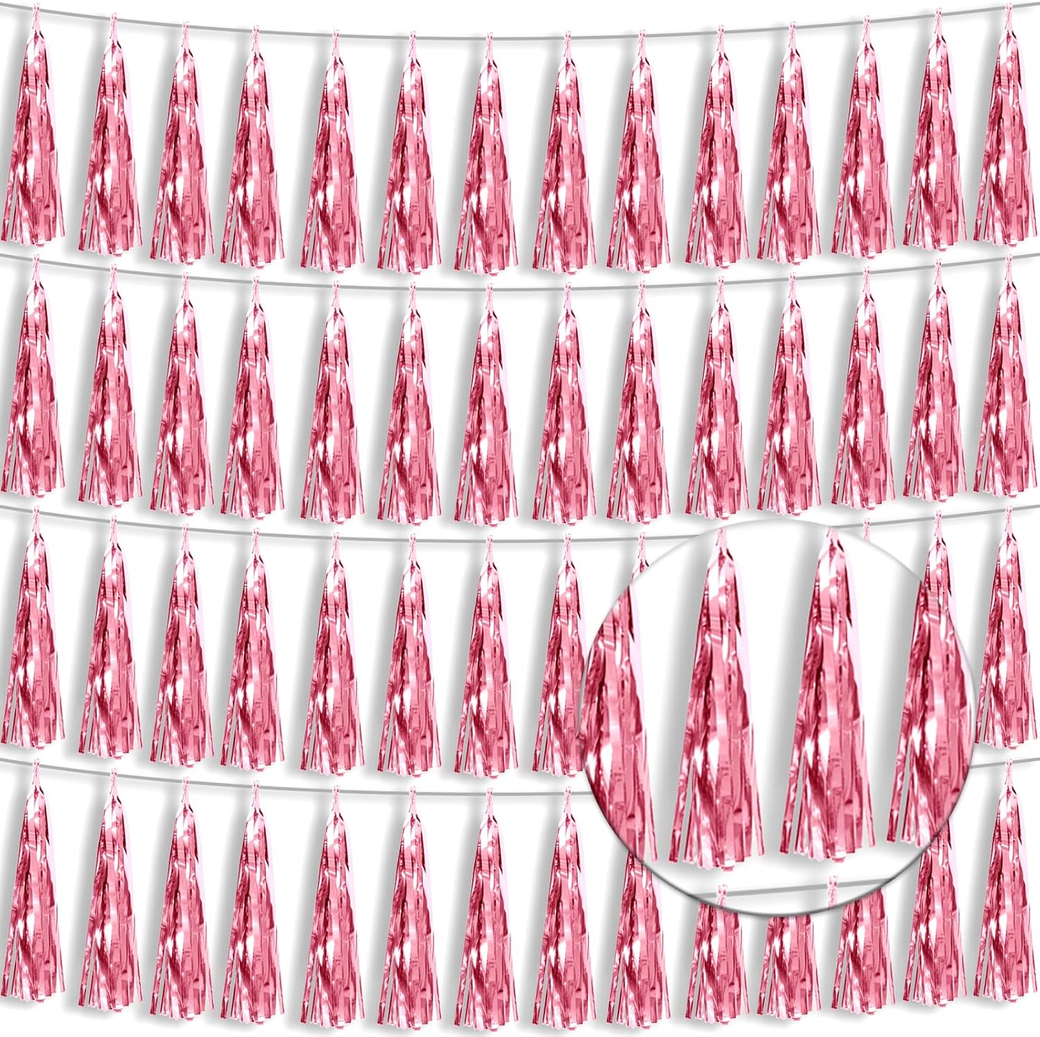 4P Pink Foil Fringe Tassel Banner Garland Metallic Tinsel Streamers Wall Hanging Curtain Backdrop Banner for Parade Floats, 2024 Graduation Decorations, Wedding Party Decoration