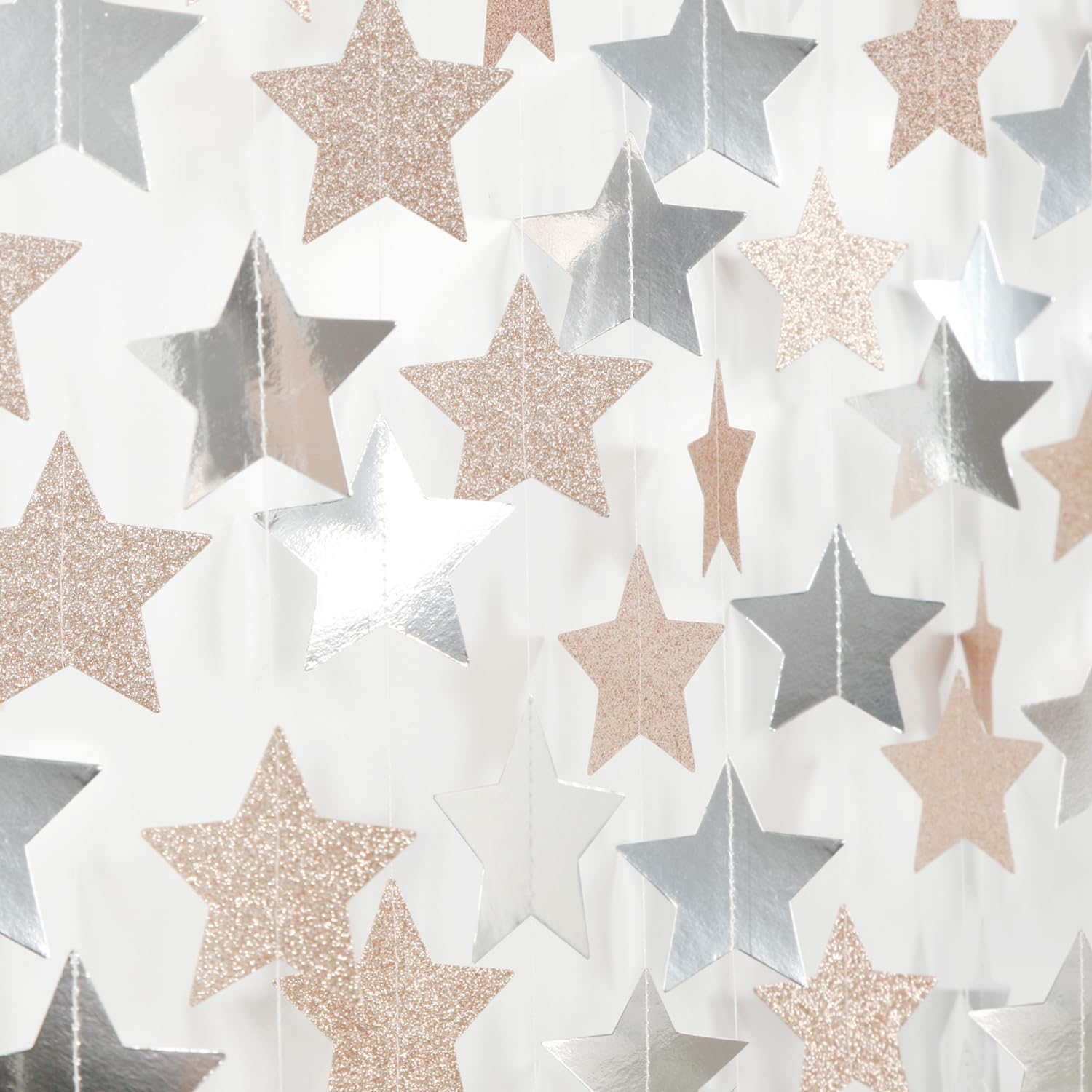 - PACKAGE CONTAINS: This streamers has four champagne glitter-silver paper star garlands, the length of each strand is 4.7 meters/11.5 feet, the total length is 18.8 meters/62 feet.