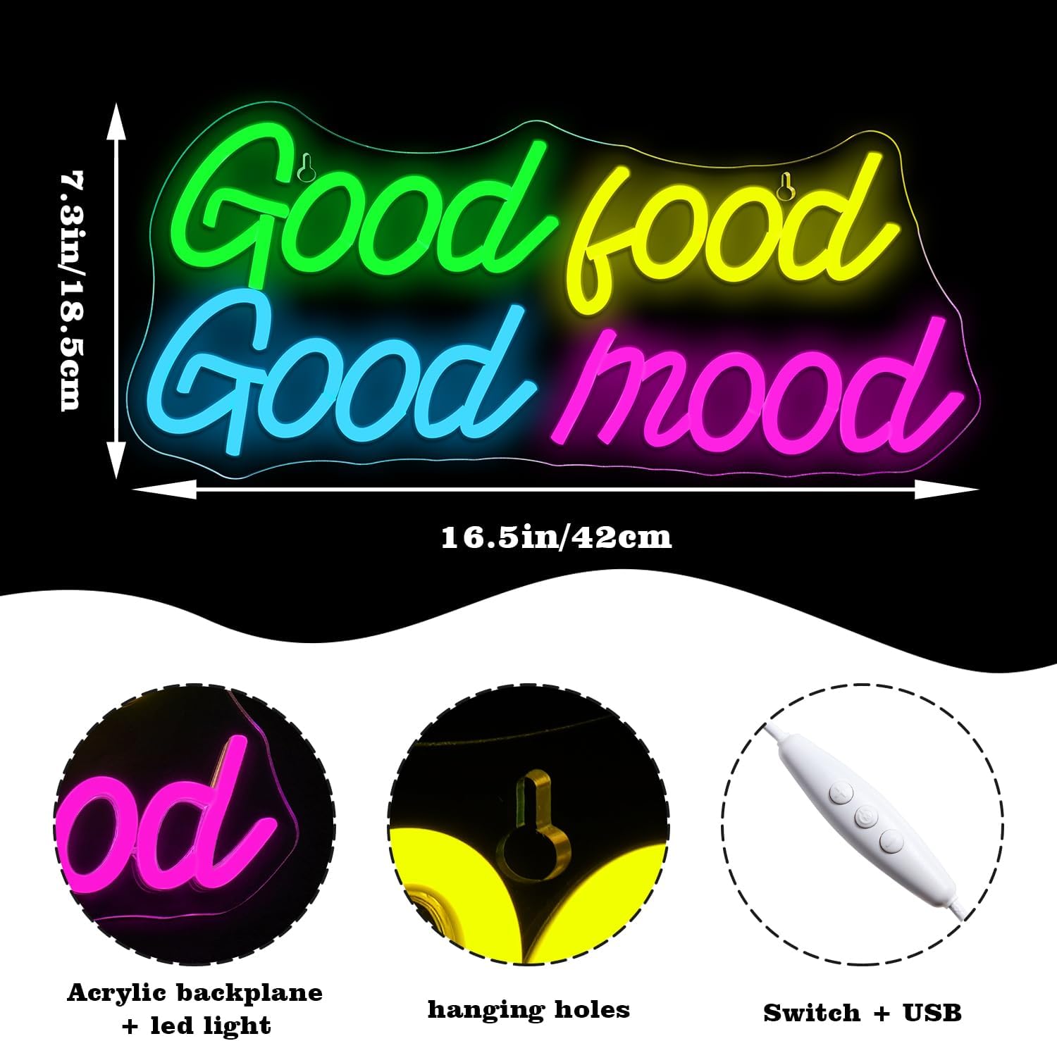 - Good Food Good Mood Neon Sign:Whether in kitchens, business offices, restaurants or cafes, this sign is more than just an ordinary signage. The lighting in different scenarios can set a cozy and pleasant atmosphere, making it an excellent decorative choice that seamlessly combines functionality with aesthetic charm.