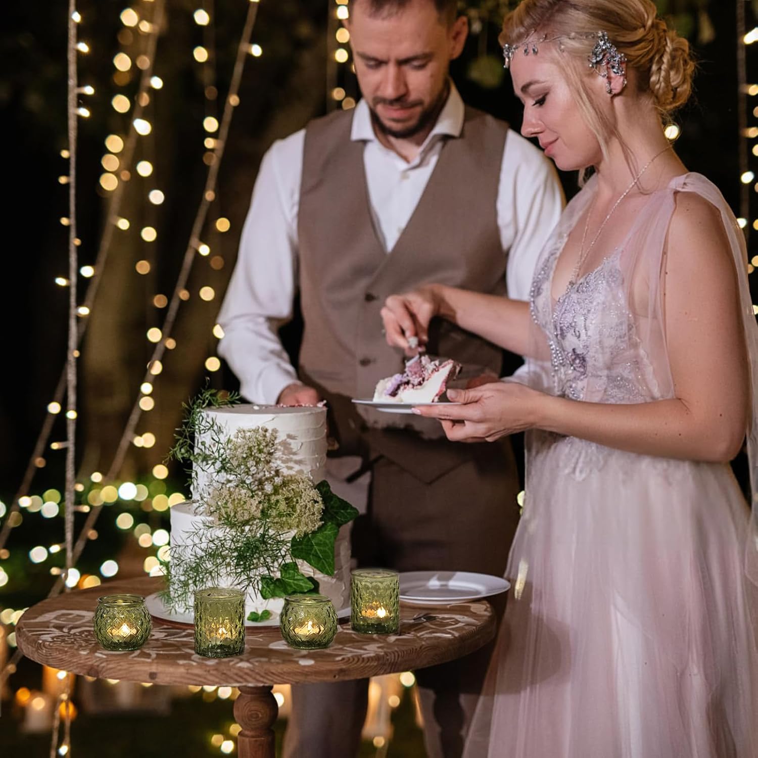 - Wedding Decor: The green candle holder serves as a beautiful and eye-catching decoration at a wedding.Whether used as centerpieces on tables, lining the aisle, or scattered throughout the venue, the green candle holders are sure to make a memorable impression and add a special touch to the wedding celebration.