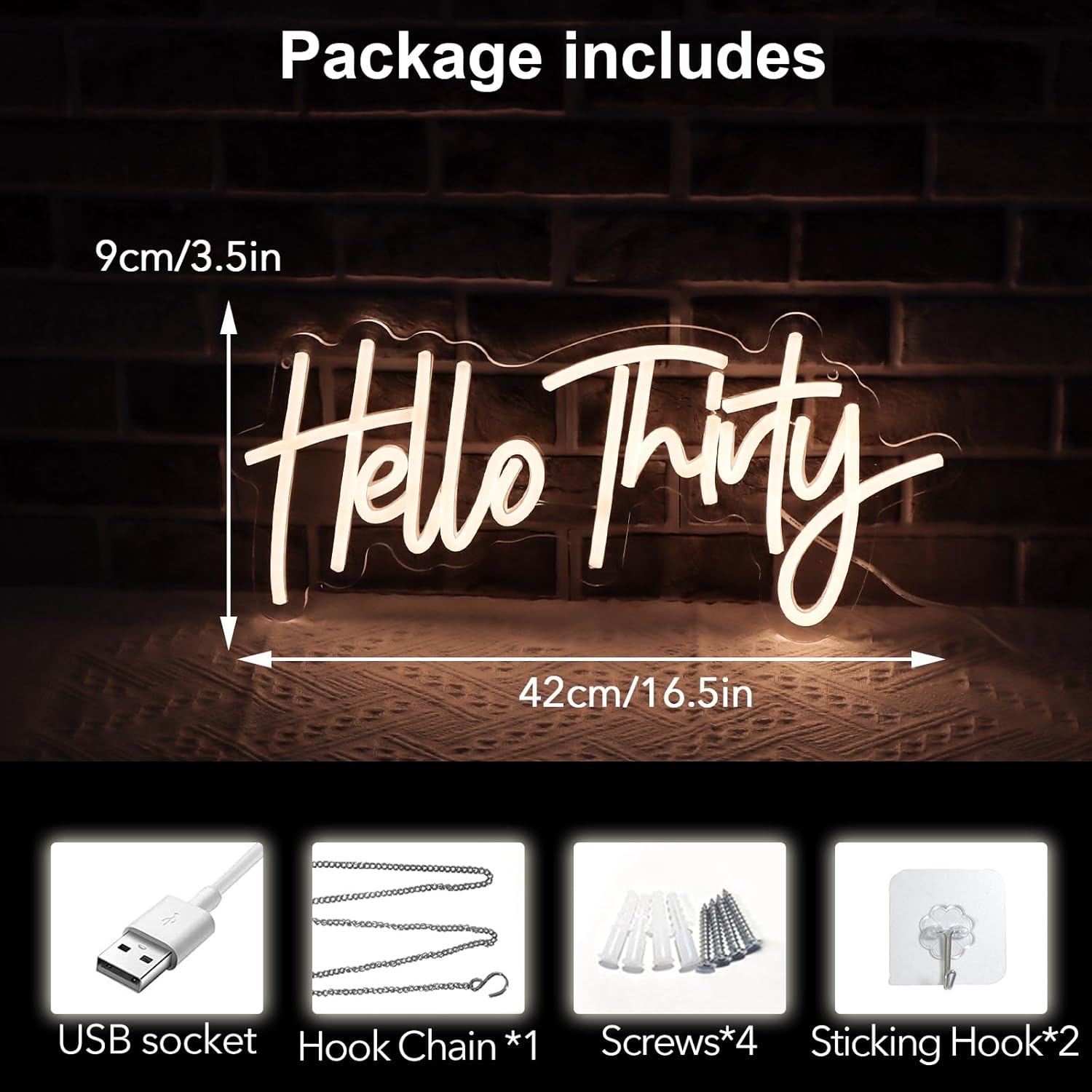 - 【Neon Light Data】--The size of the hello thirty LED logo is 42 x 9 cm/16.5 x 3.5 inches, equipped with a 150 cm/59 inch USB cable. The warm white 30th light packaging box also comes with a metal chain * 1 and expansion screws * 4. There are two pre drilled holes on the acrylic backboard for easy hanging. 30 birthday words Neon LED indicator light with 5V low voltage, an energy-saving choice for commercial and household use.