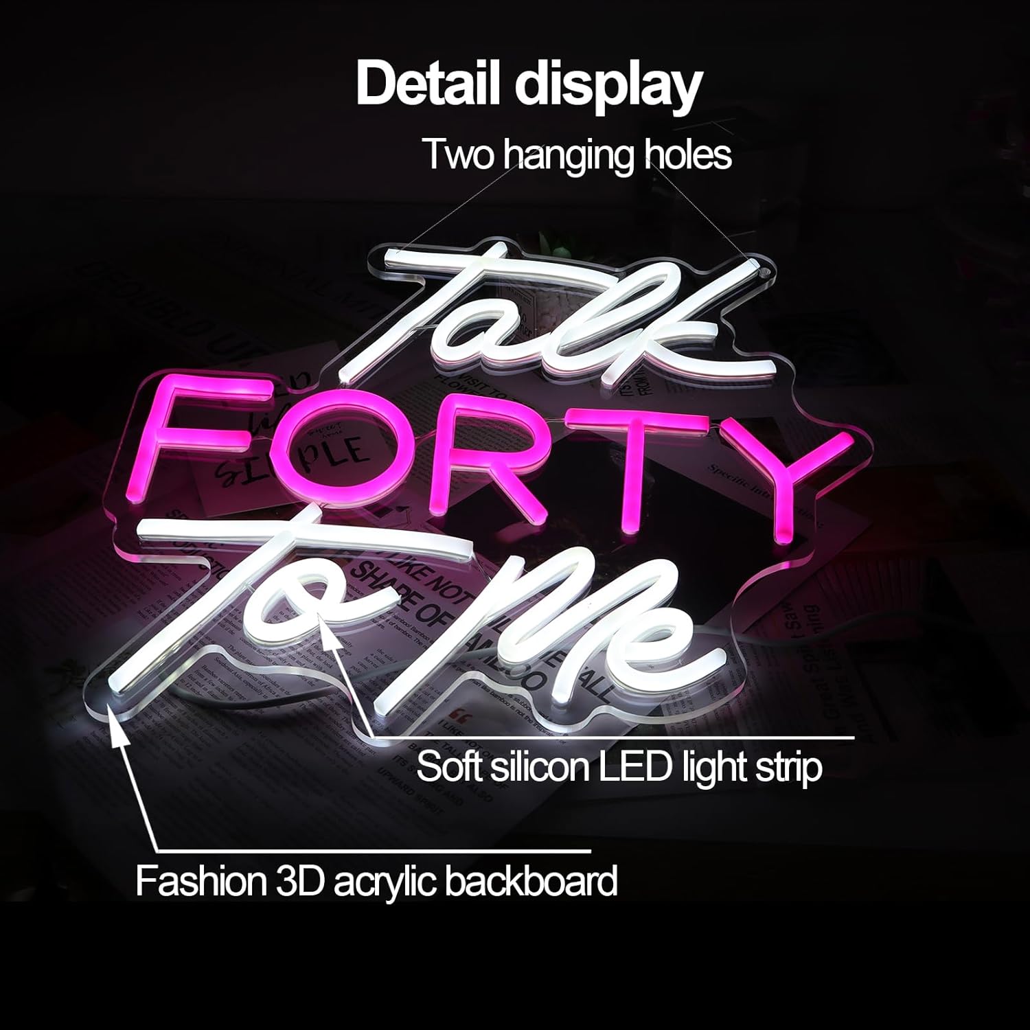 - 【Neon Light Data】--The size of the talk 40 logo is 36 x 36 cm/14.2 x 14.2 inches, equipped with a 150 cm/59 inch USB cable. The 40 gifts neon light packaging box also comes with a metal chain * 1 and expansion screws * 4. There are two pre drilled holes on the acrylic backboard for easy hanging. Neon LED indicator light with 5V low voltage, an energy-saving choice for commercial and household use.