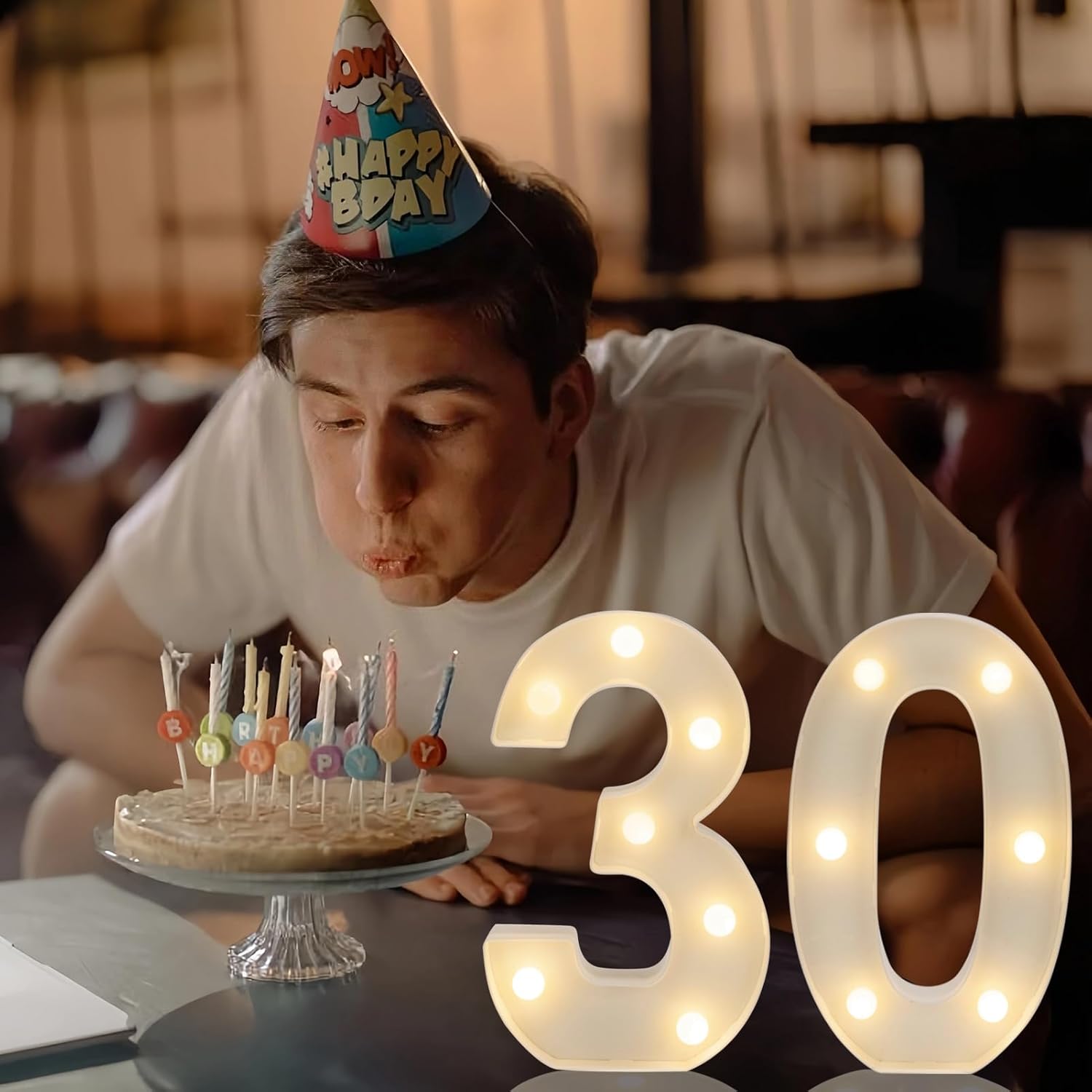 - 【Light Your Birthday Day】 Light up your birthday party with our light up letters spelling out ''30''.Light up the wonderful moments with LED number lights, warm color lights create a warm atmosphere, make your 30th birthday party more unforgettable and sparkling!