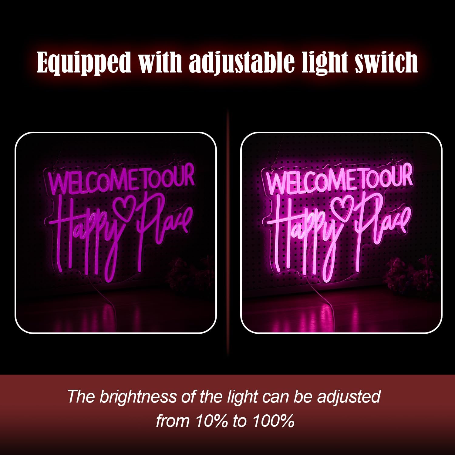 - Happy Neon Light: Welcome to our happy place Neon sign, as perfect decorations, are suitable for various occasions. The romantic pink tone illuminates any dull space, making the environment unique and creating a joyful atmosphere for your important activities.