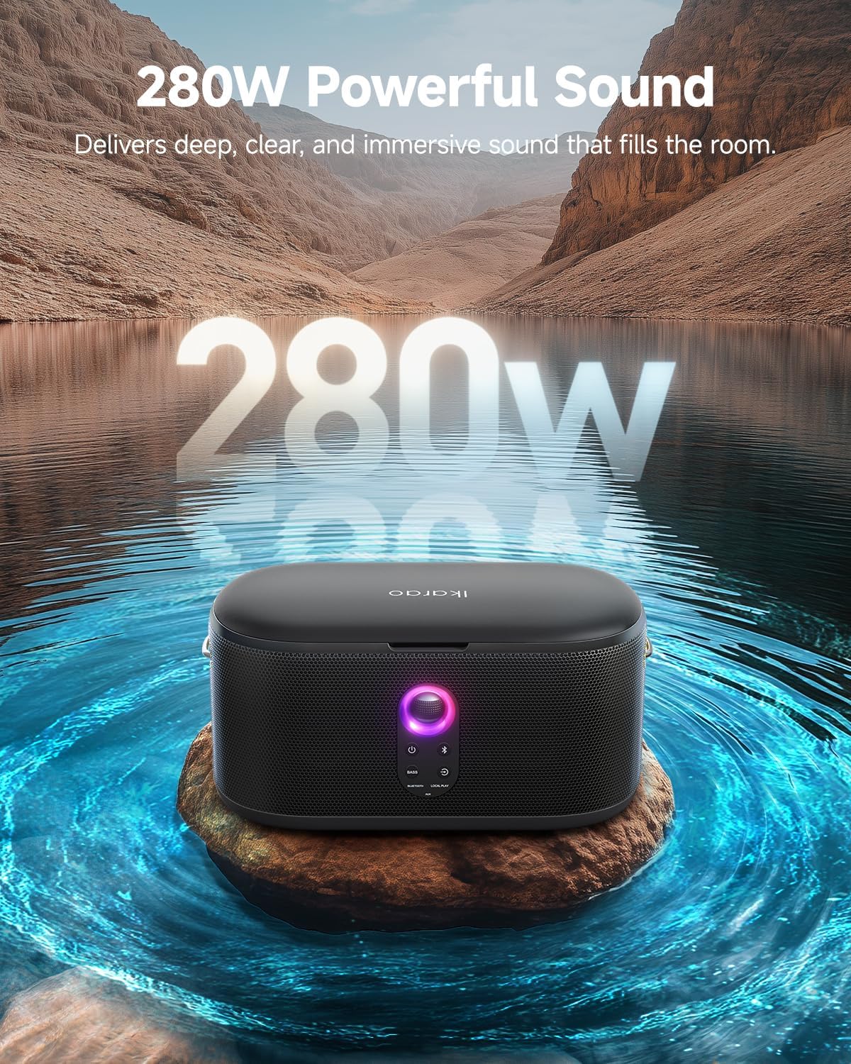 - Powerful 280W Stereo Sound with Deep Bass: Equipped with dual 3.5-inch woofers and 1-inch tweeters, this karaoke speaker delivers clean, deep bass and crystal-clear highs, creating a concert-like audio experience. Perfect for both indoor and outdoor events, filling spaces up to 800 ft² with max SPL of 104dB.
