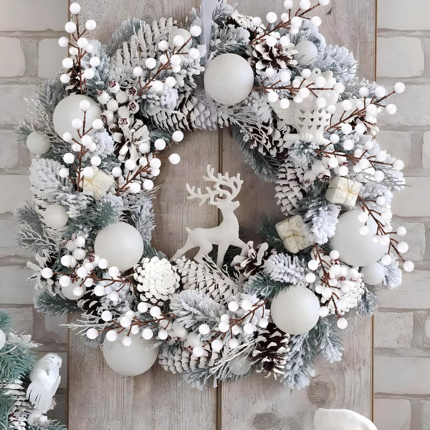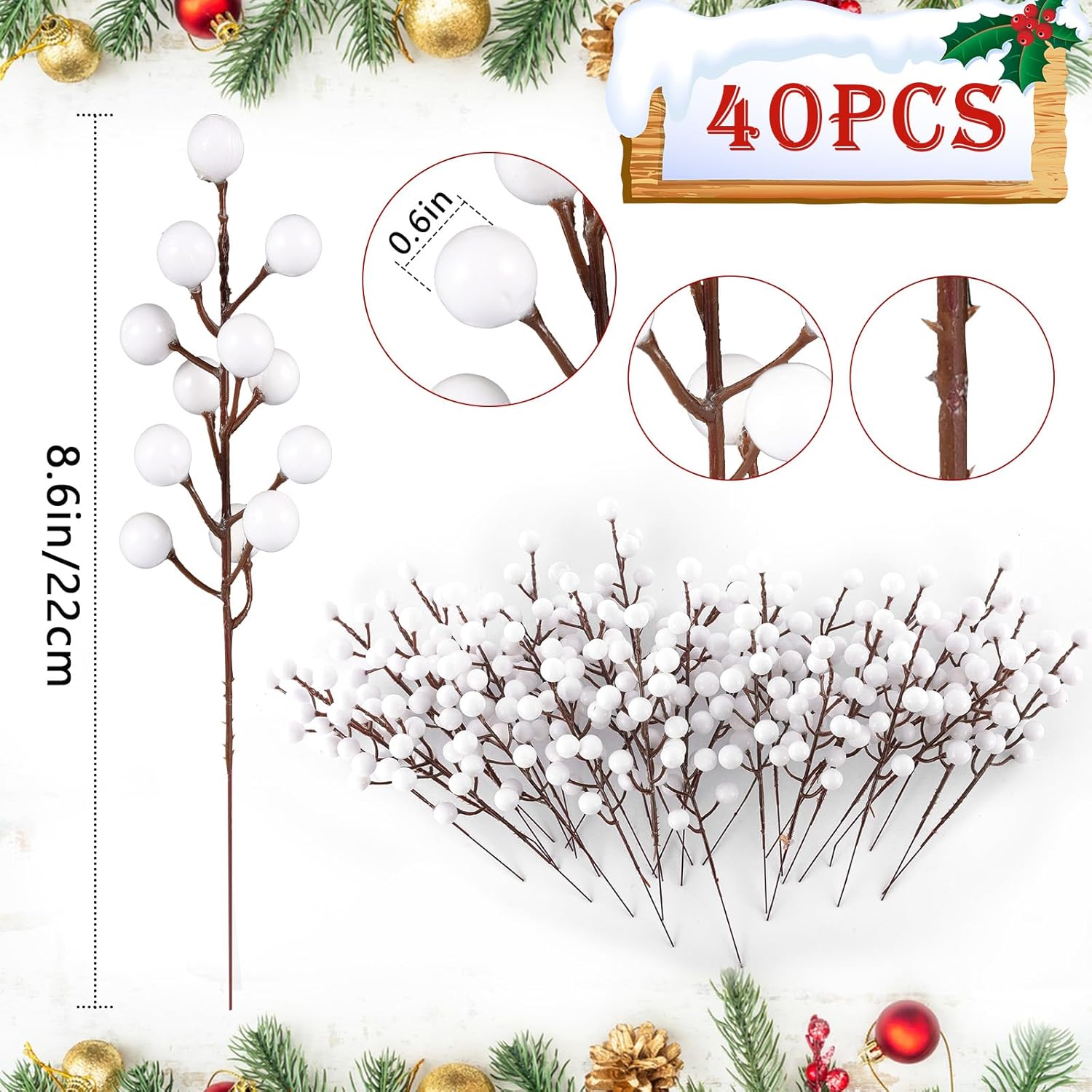 40 Pcs Artificial Berry Stems Branches, Christmas White Faux Holly Berries Picks Ornaments for Christmas Tree Wreath DIY Craft Decorations Holiday Home Decor (40, White)