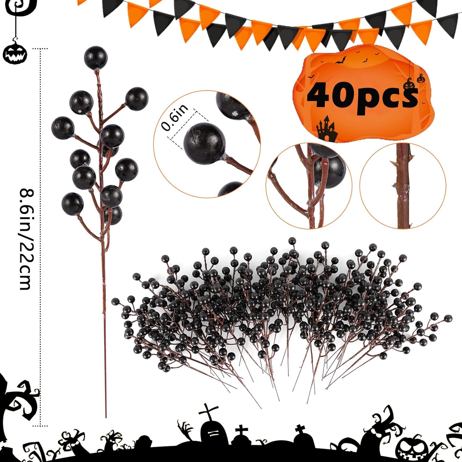 40 Pcs Artificial Berry Stems Branches, Halloween Black Faux Holly Berries Picks Ornaments for Christmas Tree Wreath DIY Craft Decorations Holiday Home Decor (40, Black)