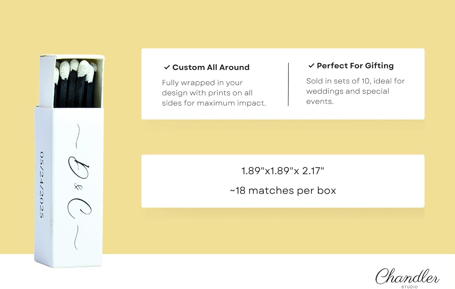 - Elevate your wedding with our Chandler Studio Custom Matchboxes, designed to add a personalized touch to your special day. Each set includes 10 matchboxes, perfect as unique wedding favors that your guests will love. Customize each matchbox with names, dates, or special messages to create memorable keepsakes that reflect your personal style.
