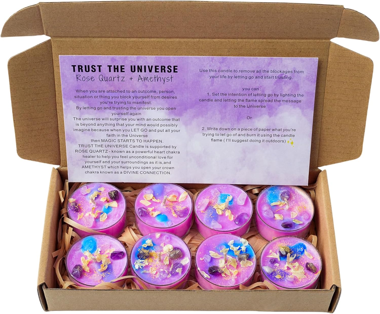- Tea Lights set of 8 candles: rose + quartz + amethyst. Believe in the Universe Candles are supported by Rose Quartz - known as a powerful heart chakra healer that can help you feel unconditional love for yourself and your surroundings, and Amethyst that can help you open the top chakra known as the Divine Connection.