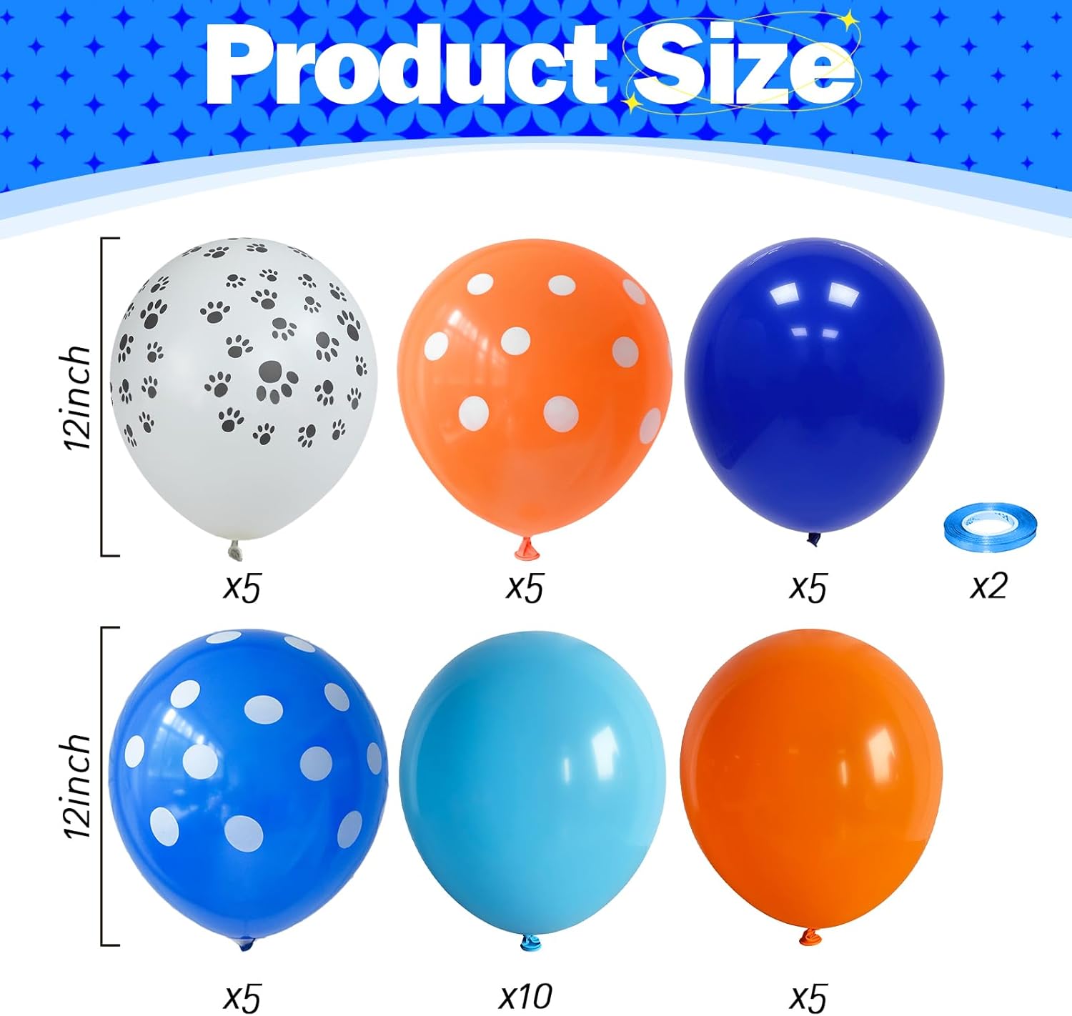 - 🦴 Blue and Orange Balloons Set: This is a beautiful bright balloon, which contains balloons of different colors. Include 12 inch dog paw print balloon(5pcs), light blue balloon(10pcs), royal blue balloon(5pcs), orange balloon(5pcs), orange white print balloon(5pcs), dark blue white print balloon(5pcs), 2 rolls of ribbons. You can use these different shades of blue and orange balloon kits, DIY balloon combinations to create your birthday party.
