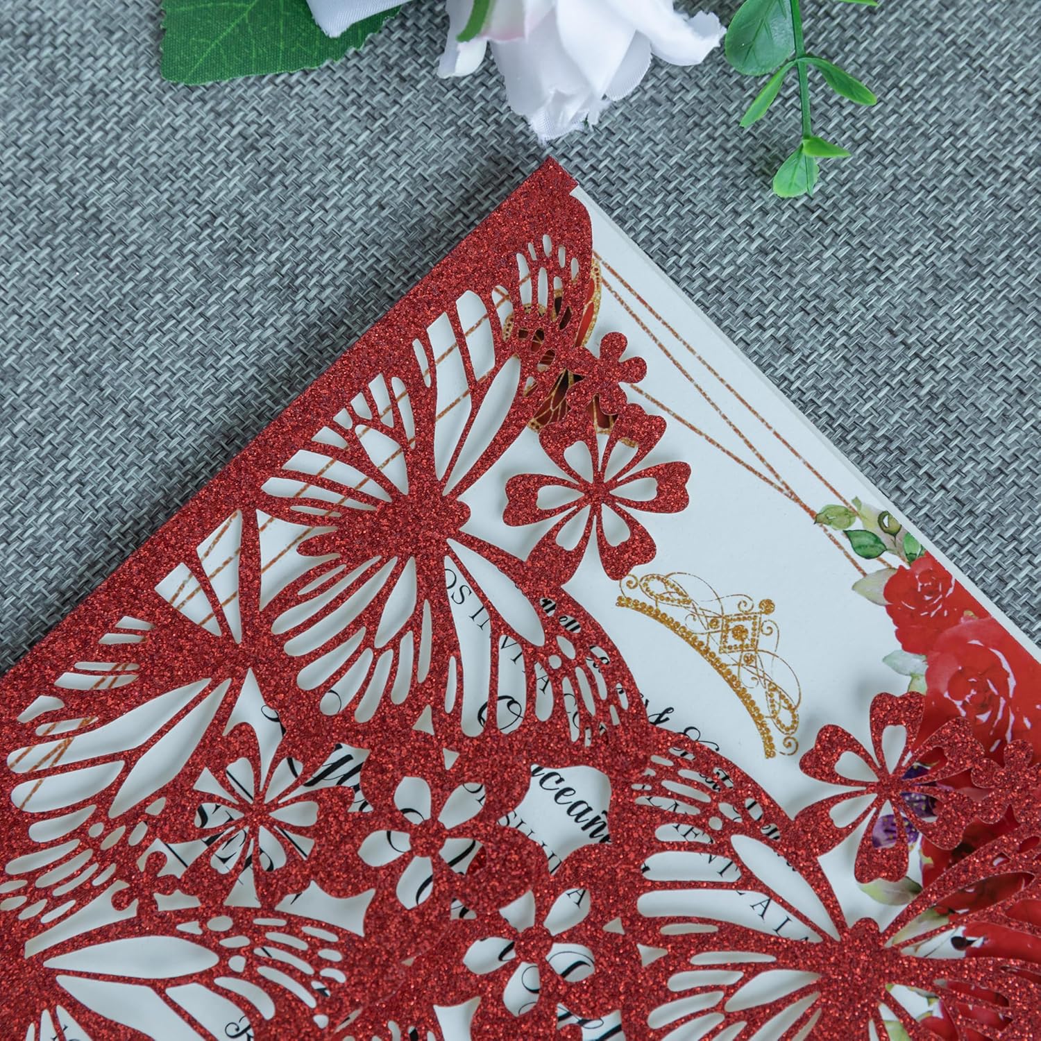 20 PCS 5.12x7.2 Butterfly Quinceanera Invitation, Laser Cut Wedding Invitation Cards with Envelopes for XV Anos Bridal Shower Baby Shower Invite (Red Glitter)