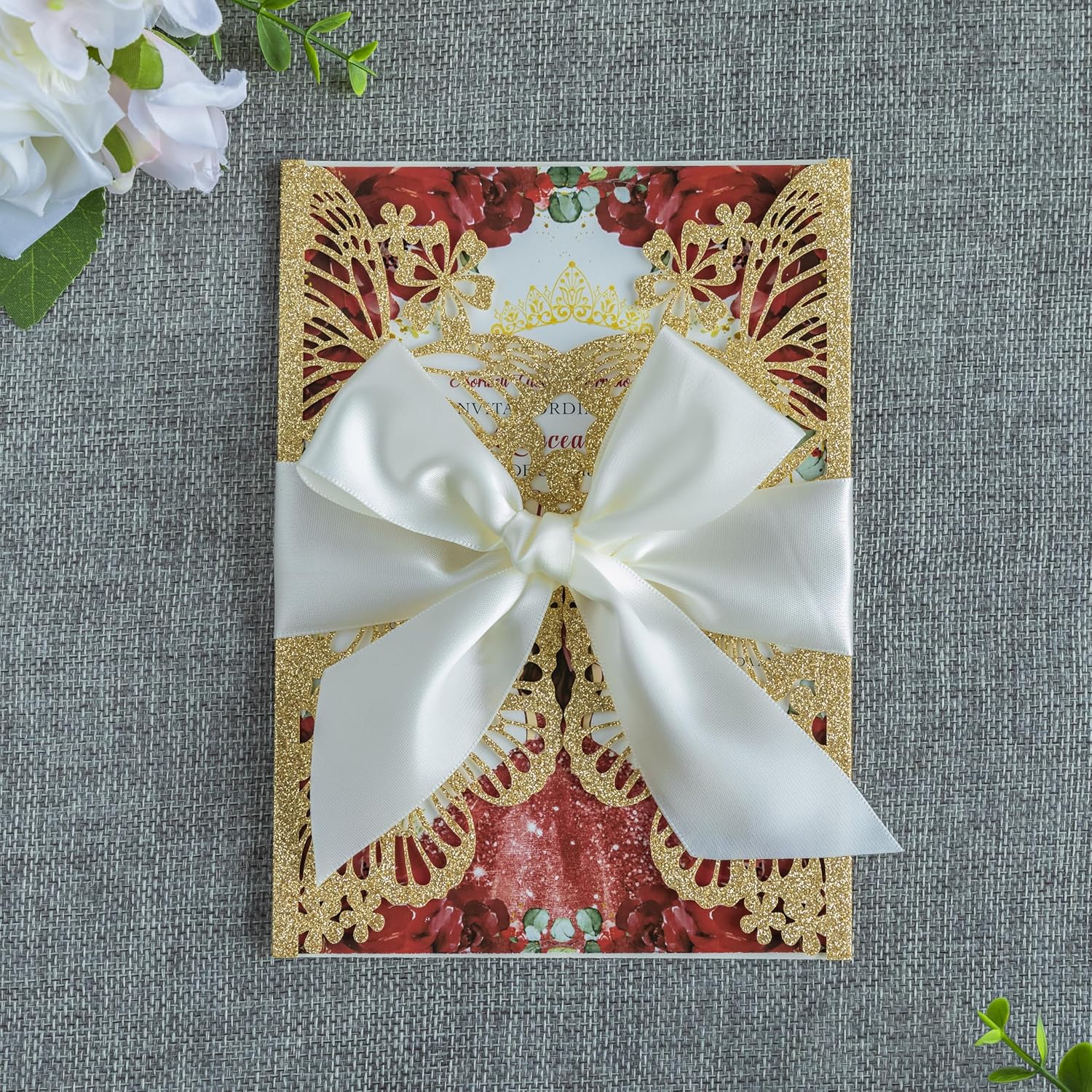 - Size of kit: laser cut invitation pocket: 5.12x7.2 inch, inner sheet card: 5x7 inch, envelope: 5.35x7.7 inch, Ribbon: 29.5x1.5 inch