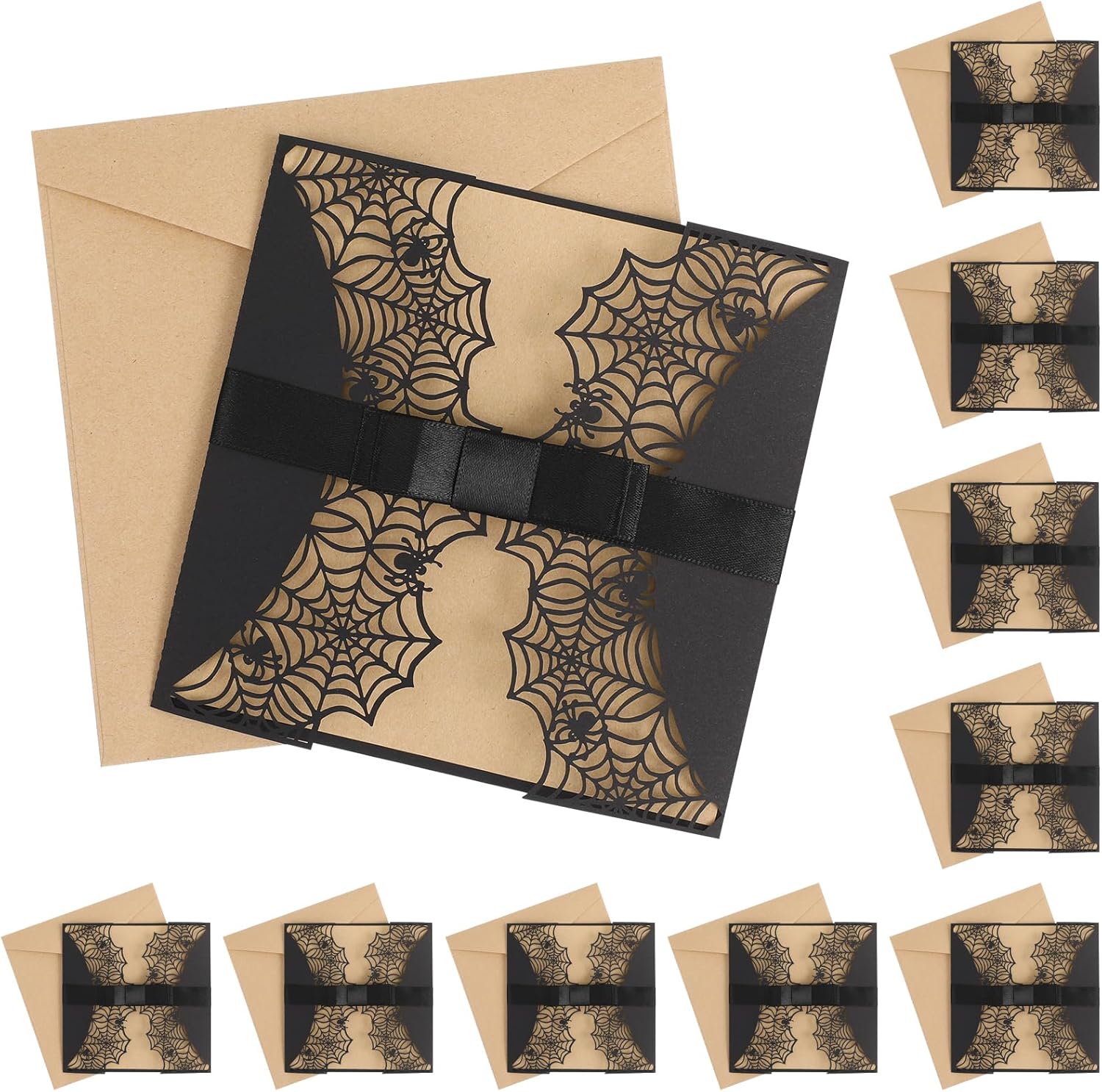 Halloween Party Invitations Cards, 10 Pcs Laser Cut Spider Web Design with Bowknots and Envelopes, Black and White