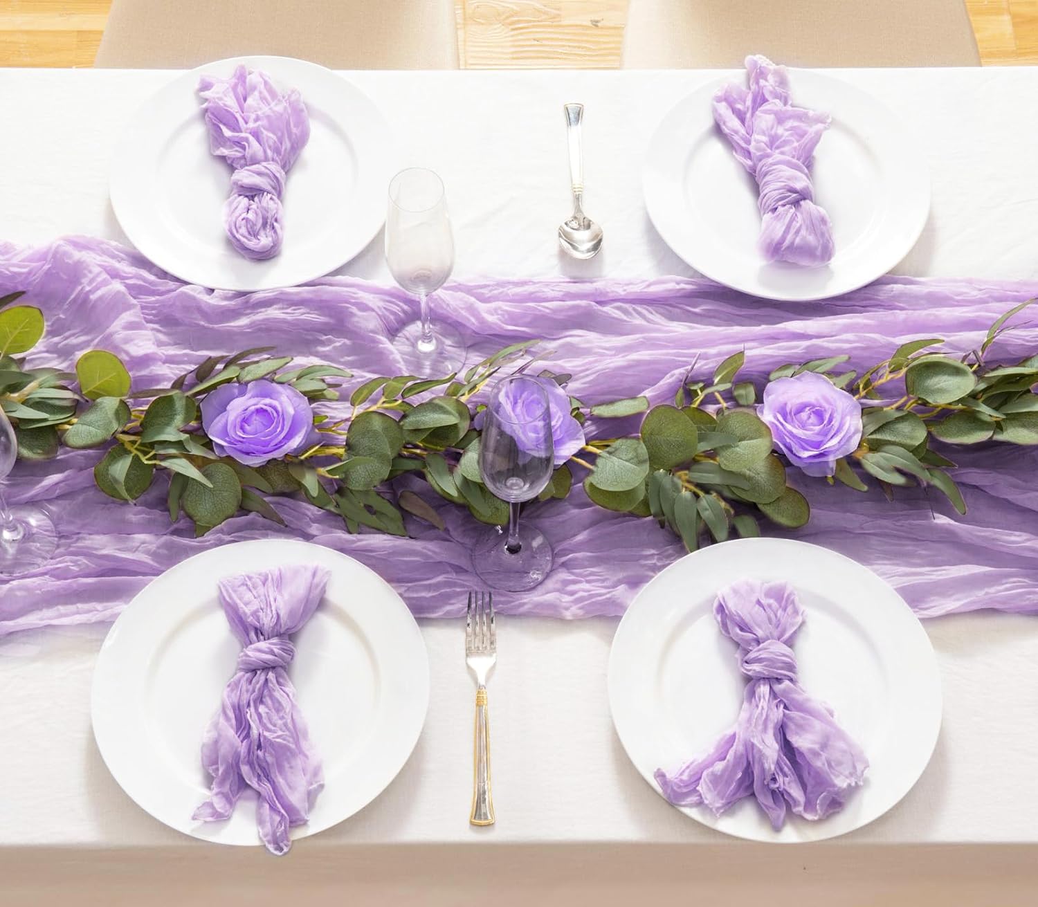 8 Pack 10Ft Table Runner 35x120 inch Purple Boho Gauze Table Cheese Cloth Long Wrinkled Sheer Table Runner for Wedding Bridal Shower Birthday Party Table Decor