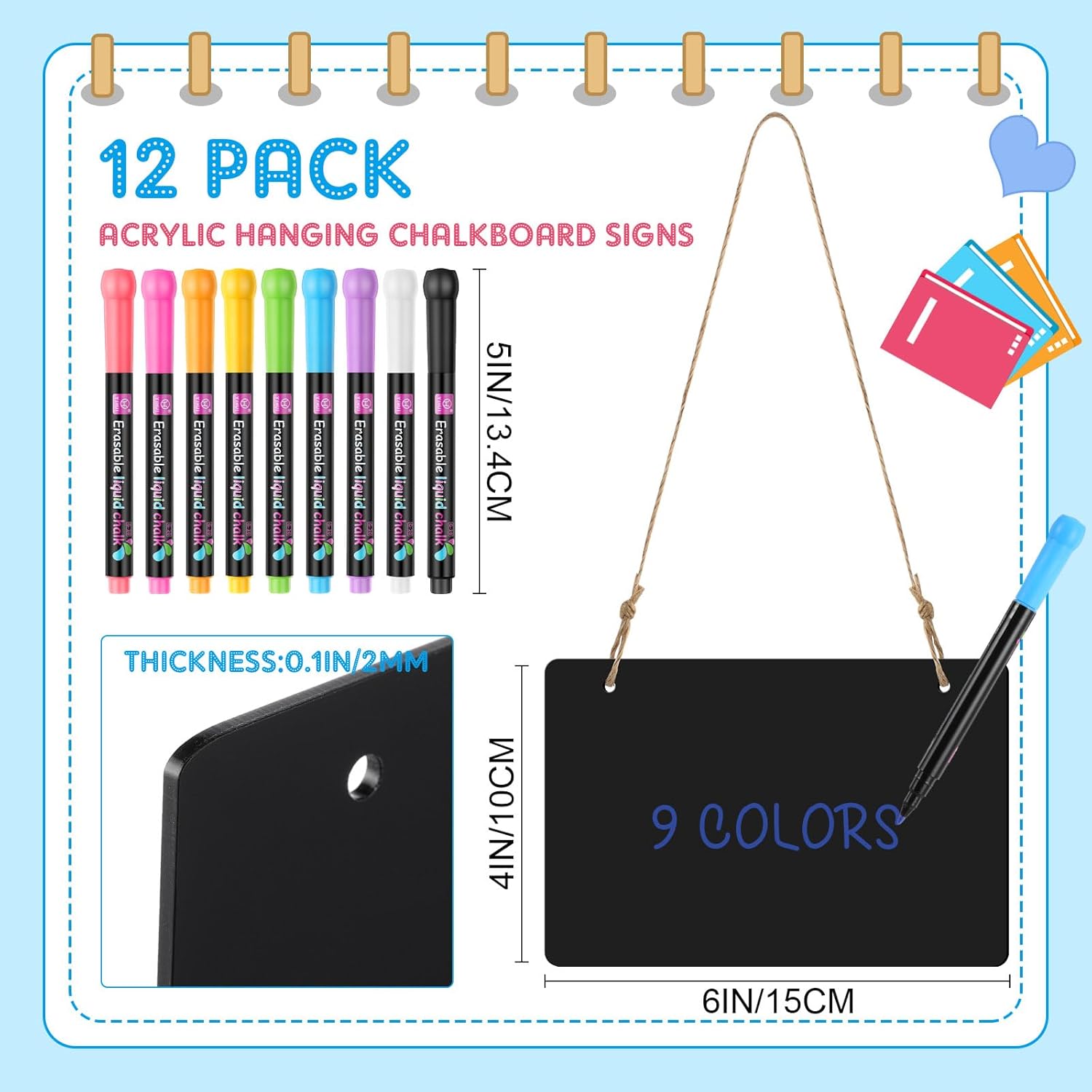 - Complete Set: when you buy this product, you not only get 12 chalk board, but also a set of 9 colorful liquid chalks, 9 colors, bright and easy to remove; Compared with traditional chalk, there is no dust flying, creating a healthier and more comfortable writing environment, which is a very cost effective choice