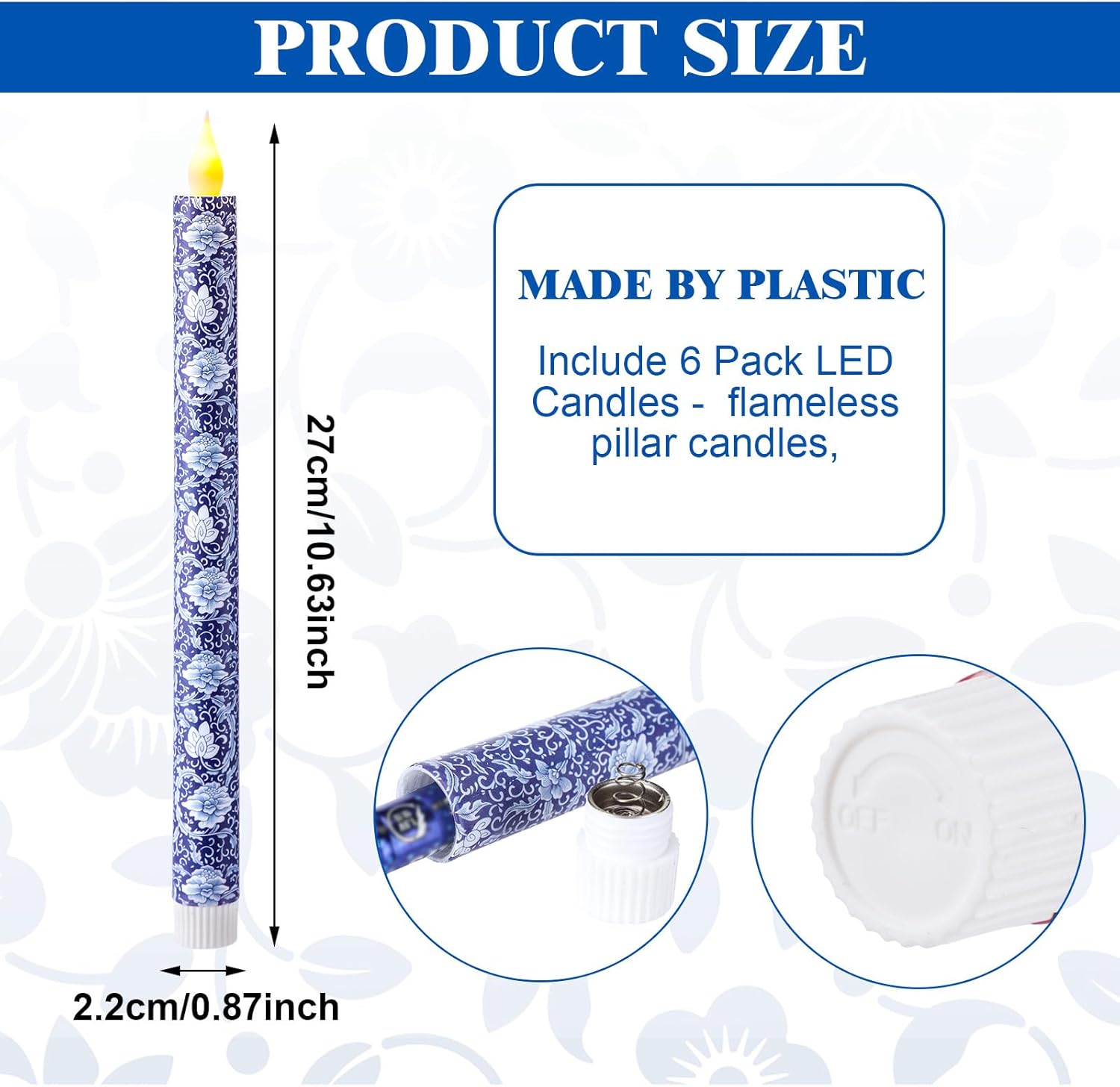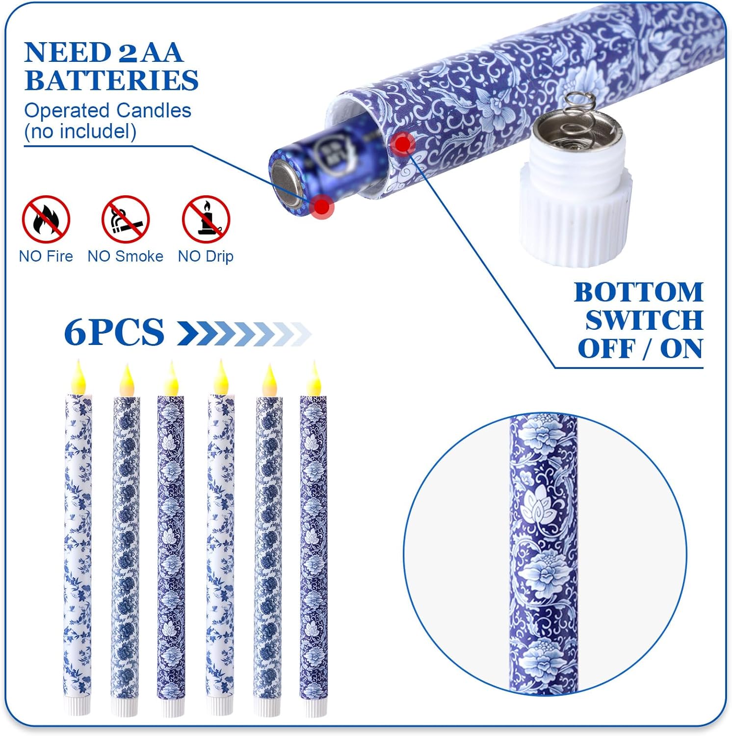 - Christmas Candles Set: come with 6 pcs chinoiserie themed flameless candles with blue and white intricate floral designs for festive decor; Each candle requires 2 AAA batteries (not included) to operate, the remote control is not included