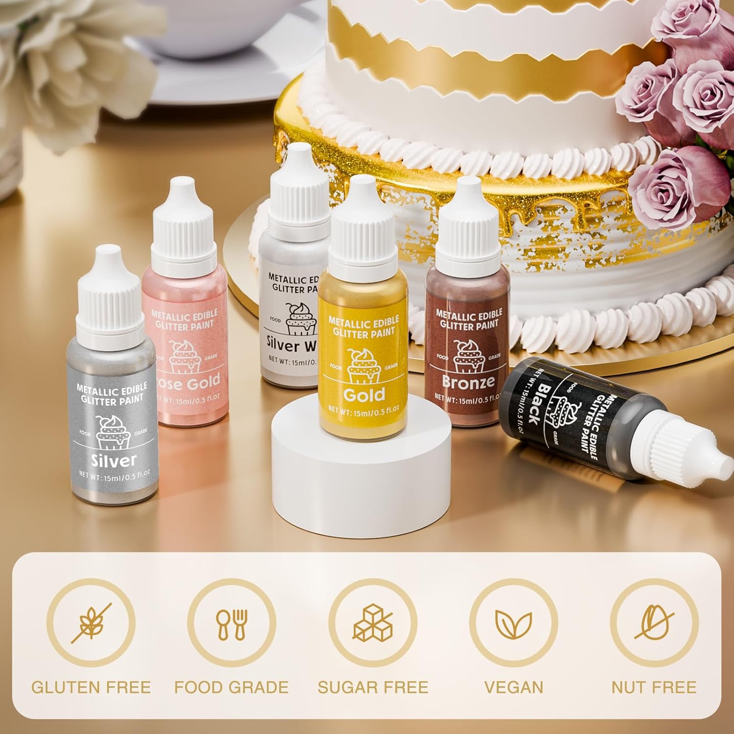 - Metallic Edible Glitter Paint Set: Our cake paint is specially crafted for food and baking decoration to create a high luster glitter effect, perfect for adding a touch of metallic finish to your cake decorating projects. 6 vivid color can be choose: Gold, Rose Gold, Siliver, Siliver White, Bronze, Black. All colors looks amazing and beatiful!