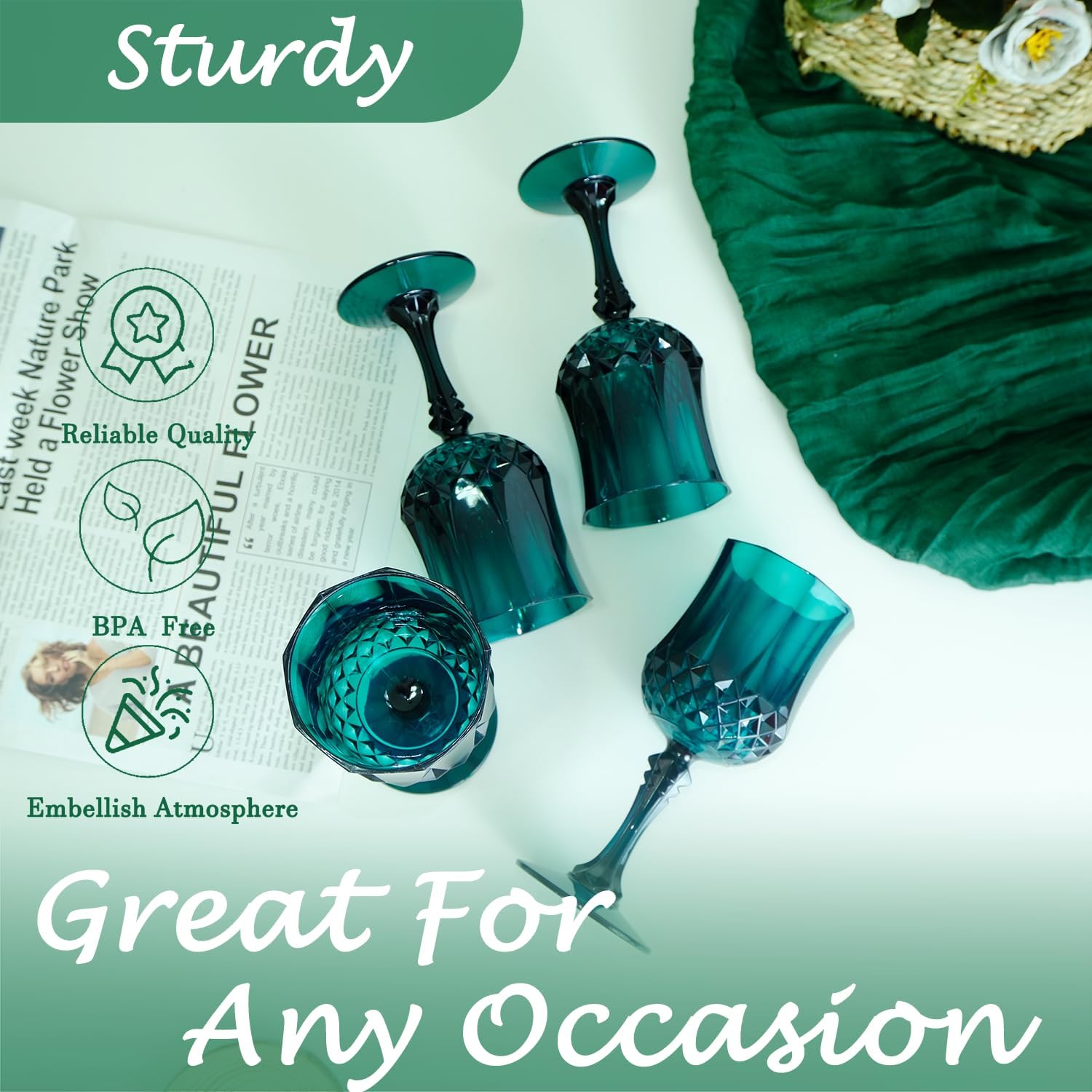 - 🍷🍷🍷【Product Description】 This set includes 12 retro-style dark green party plastic wine glasses, providing ample quantity to meet your daily use and replacement needs. The elegant and sophisticated design makes your wedding reception unique
