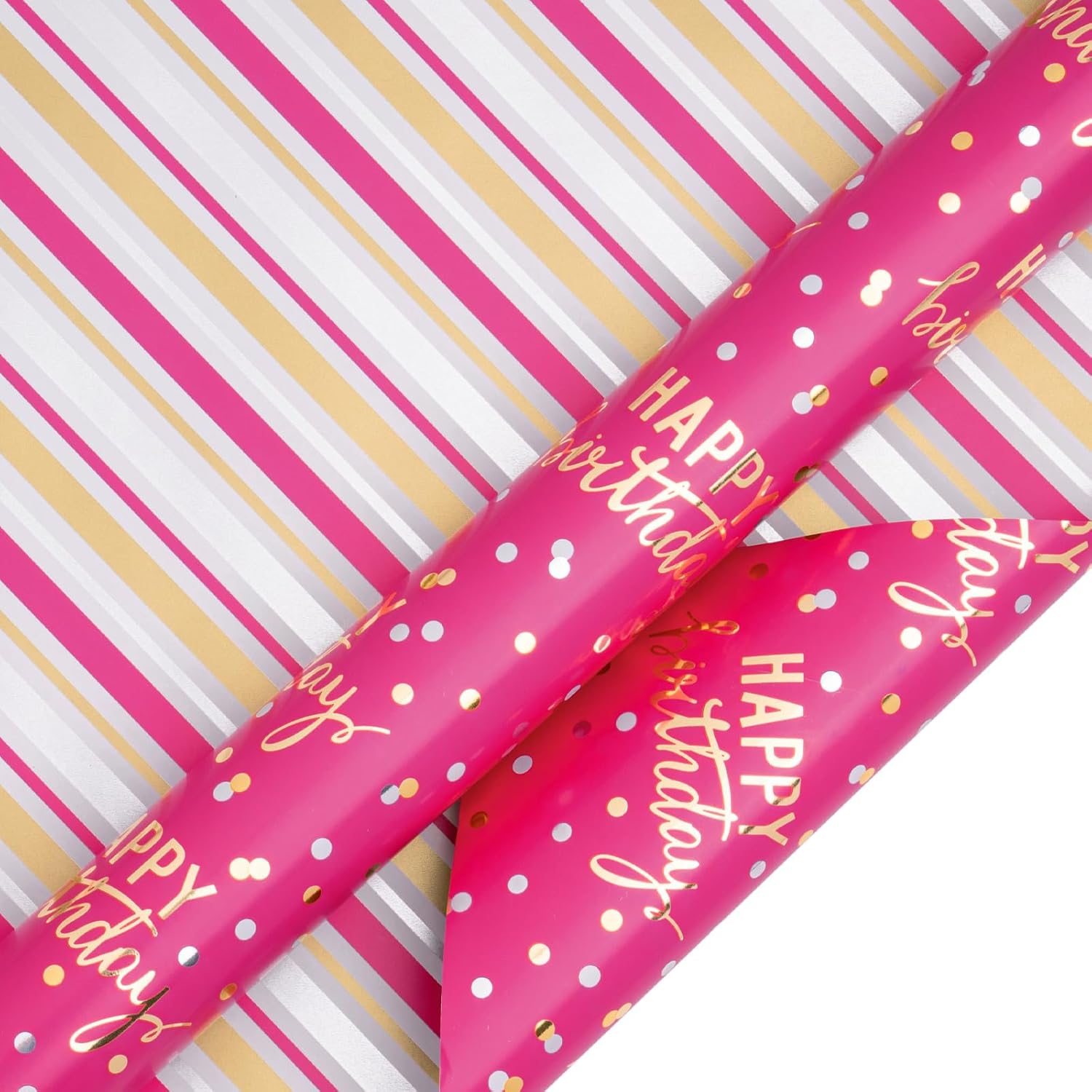 - HAPPY BIRTHDAY WRAPPING PAPER - This vibrant hot pink birthday wrapping paper features a stylish dual-sided design. One side displays "Happy Birthday" in elegant gold text with scattered metallic dots in pink, gold, and white. The reverse side features a chic striped pattern for a modern, polished look.
