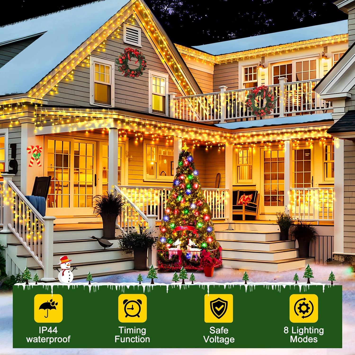- Safer and Brighter: Upgraded higher brightness string lights are enough to cover the entire yard but non-dazzling. UL Listed Plug, 29V low output and Low-temp LED bulbs ensures safe to touch even after long time use. Very safety for kids and pets. Our Christmas lights is the most classic style, lighting along the eave, deck, balcony, stairs, fence, creates a charming atmosphere.