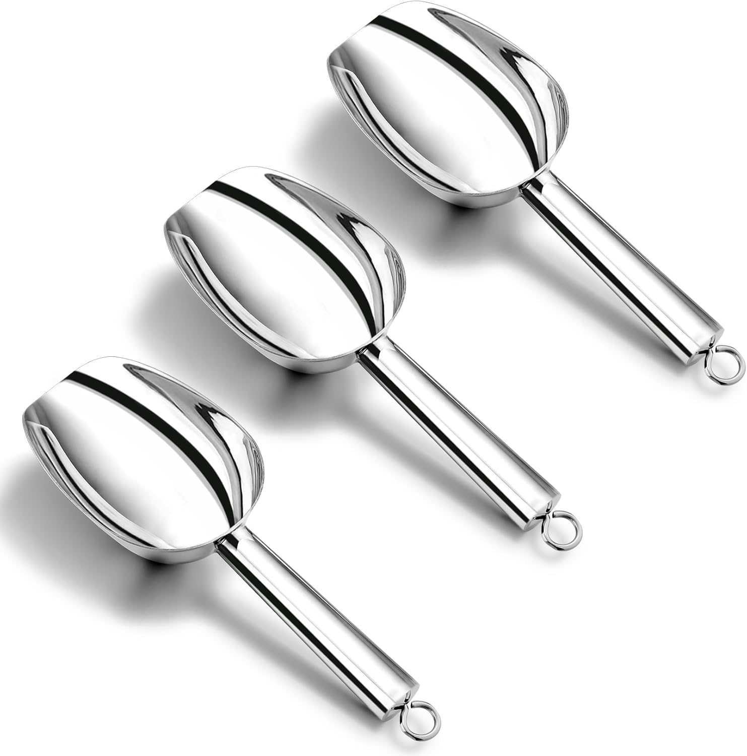 - 【Decorative & Versatile】The shiny silver scoop could match different styles of kitchens, Elegant appearance could be a embellishment to your kitchen, 3 piece set would meet your any needs, Scooping from ice cubes, candy, coffee bean to dry food, And even pet food, Great for a wide range of use in home