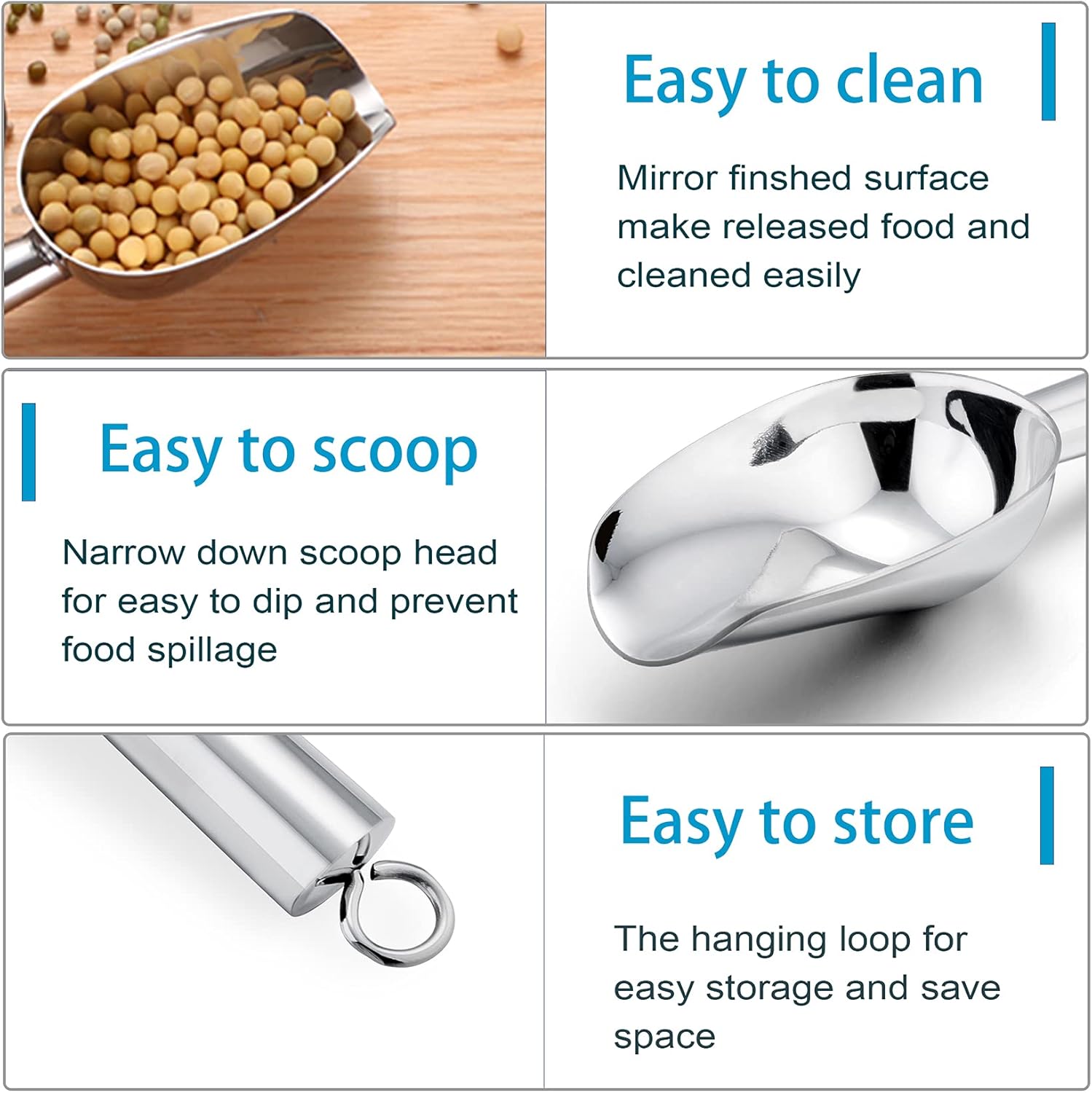 - 【Easily Use & Store】Ice scoop designed with a narrow head for scooping food easily without leaking or dropping, Small size is great to fit in jars, Bins, or containers, Hanging loop at the handle's end for easy storage, Saving space and keeping your kitchen organized and tidy