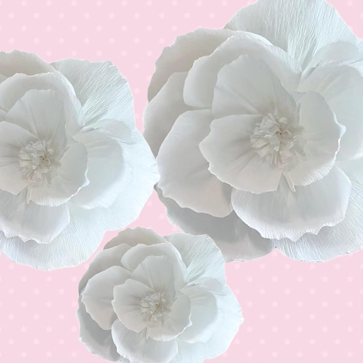 - Crepe Paper Flowers: Total 9pcs white paper flowers in 3 sizes 12”, 10”, 8”.
