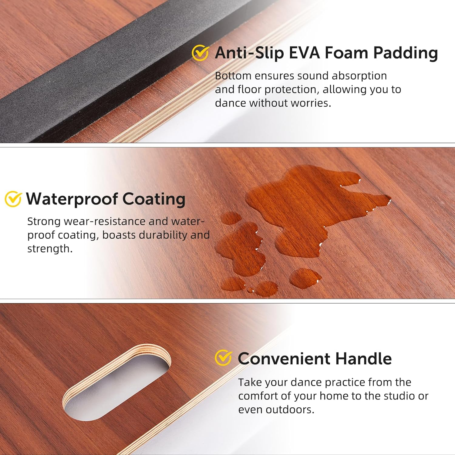 - Anti-slip process: with strong wear-resistance and waterproof coating, tap dancing board boasts durability and strength. The natural wood grain adds aesthetic appeal, The non-slip EVA foam padding enhances cushioning, protects the floor and provides quiet support while saying goodbye to tired feet and injuries for endless hours of relaxed dancing!