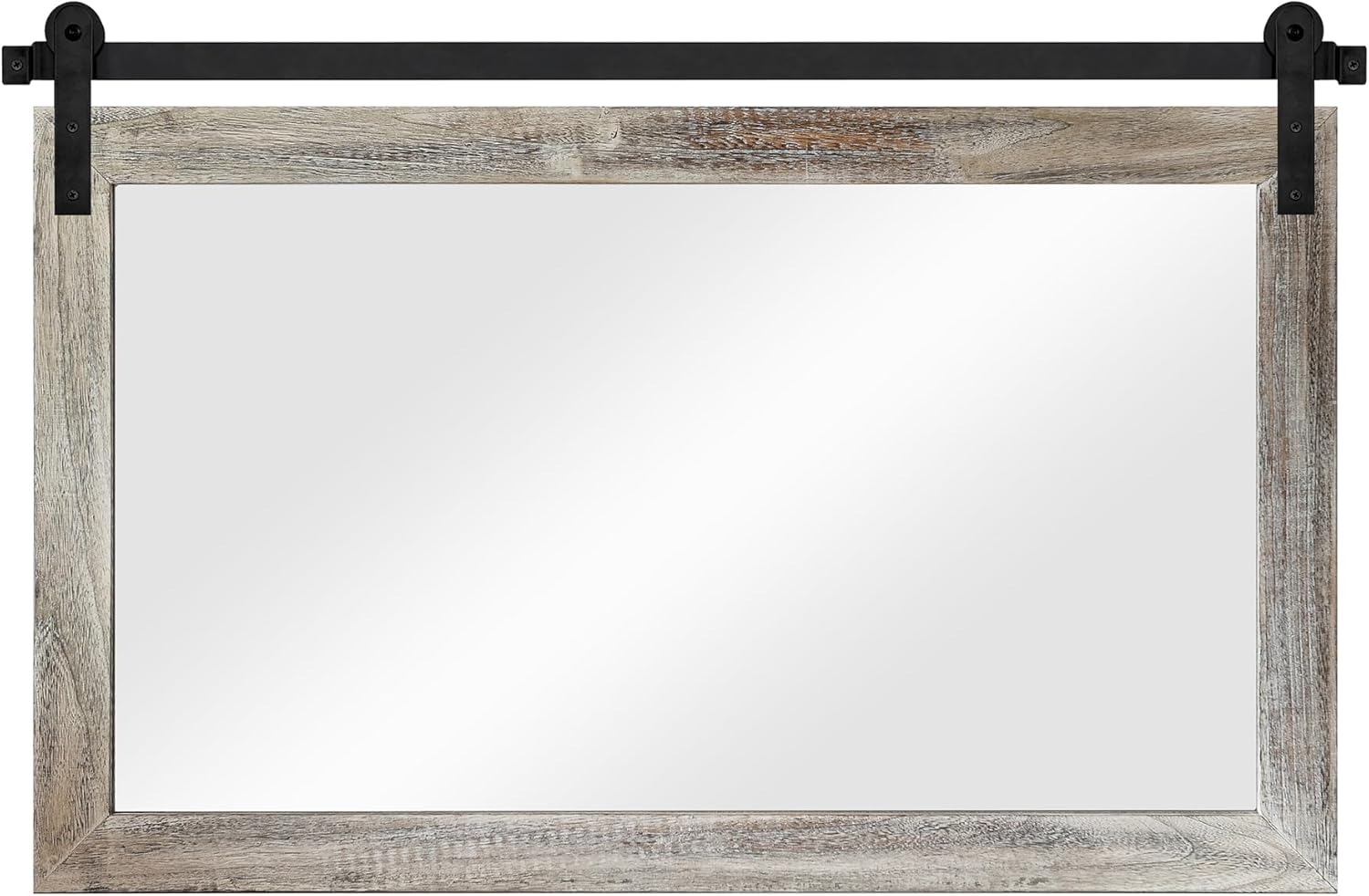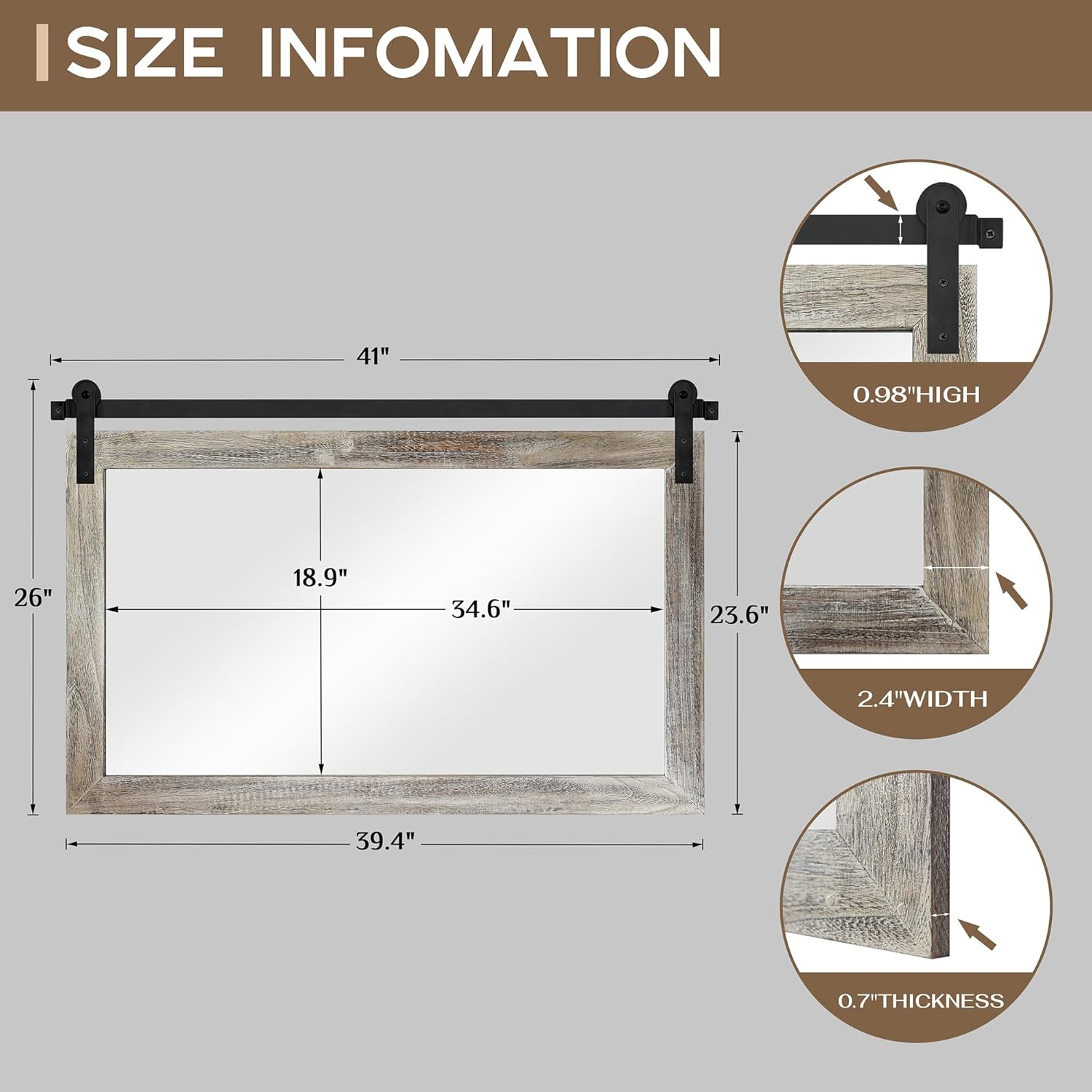 - EASY TO INSTALL: The overall size of this rustic mirror is 40.9 x 26 x 0.67 inch, and the display size of the mirror is 34.6 x 18.9 inch. The track is 41 inch. You can fix the pulleys to the mirror first, then mount the track on the wall and finally snap the pulleys onto the track to complete the hanging