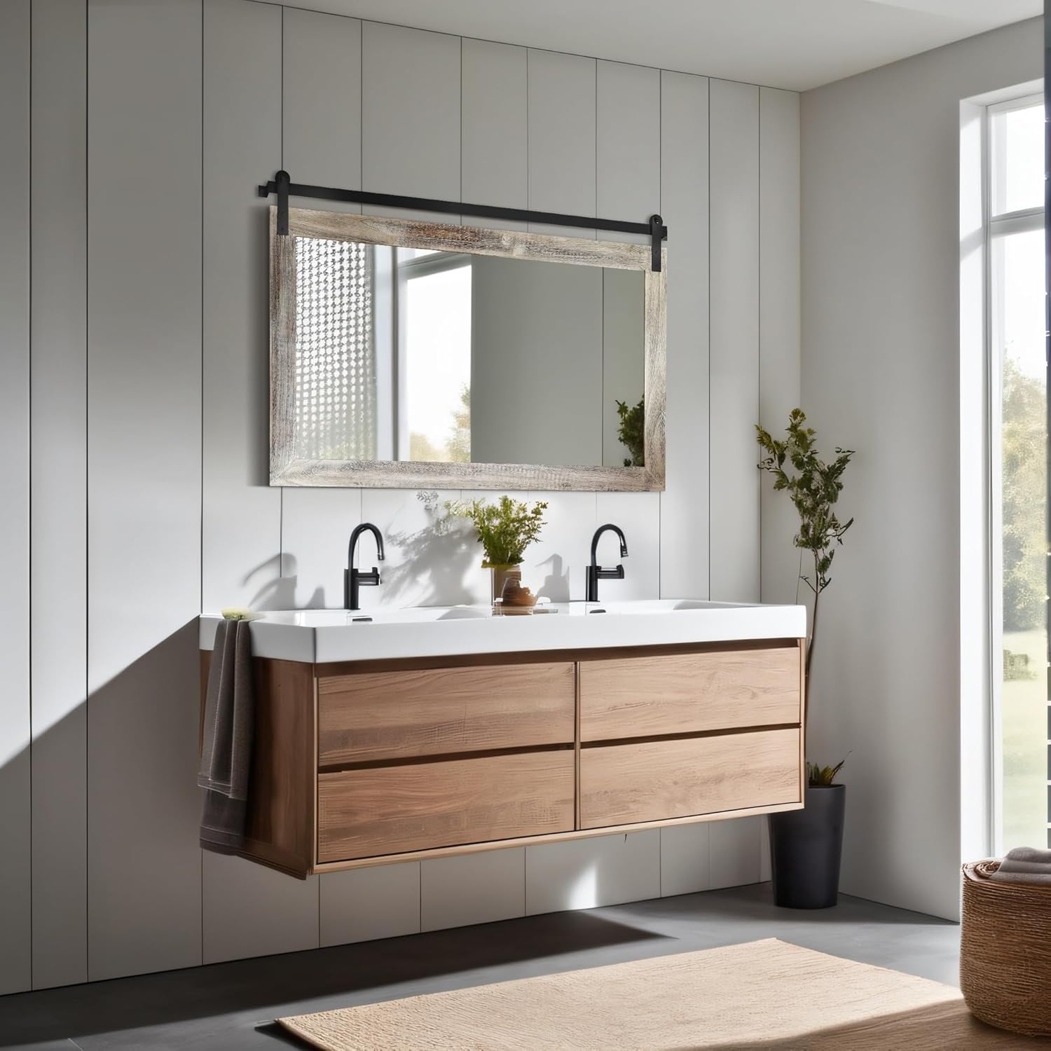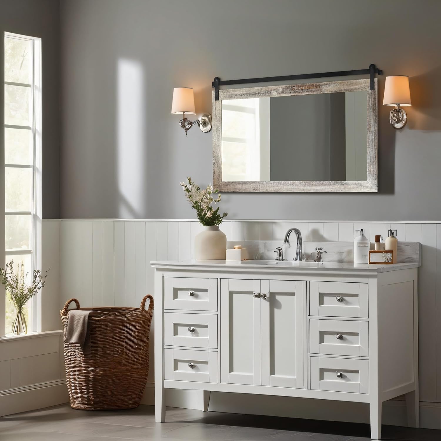 - QUALITY MATERIALS: The frame of the barn door mirror consists of an antique solid wood frame and a sturdy metal bracket. The interior features a 4mm HD silver mirror with clear and distortion-free reflections, providing a better sense of light and projection in your space