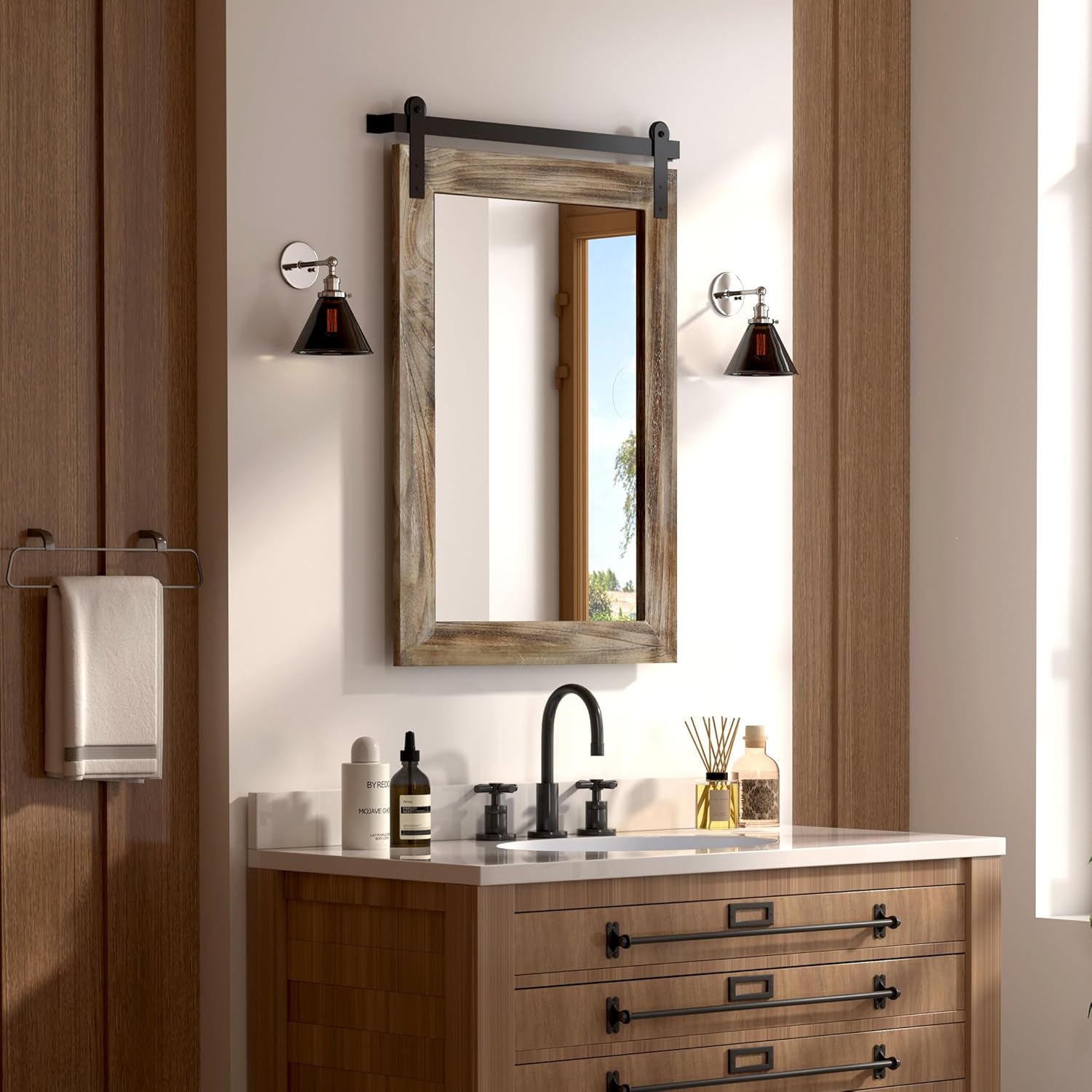 - QUALITY MATERIALS: The frame of the barn door mirror consists of an antique solid wood frame and a sturdy metal bracket. The interior features a 4mm HD silver mirror with clear and distortion-free reflections, providing a better sense of light and projection in your space