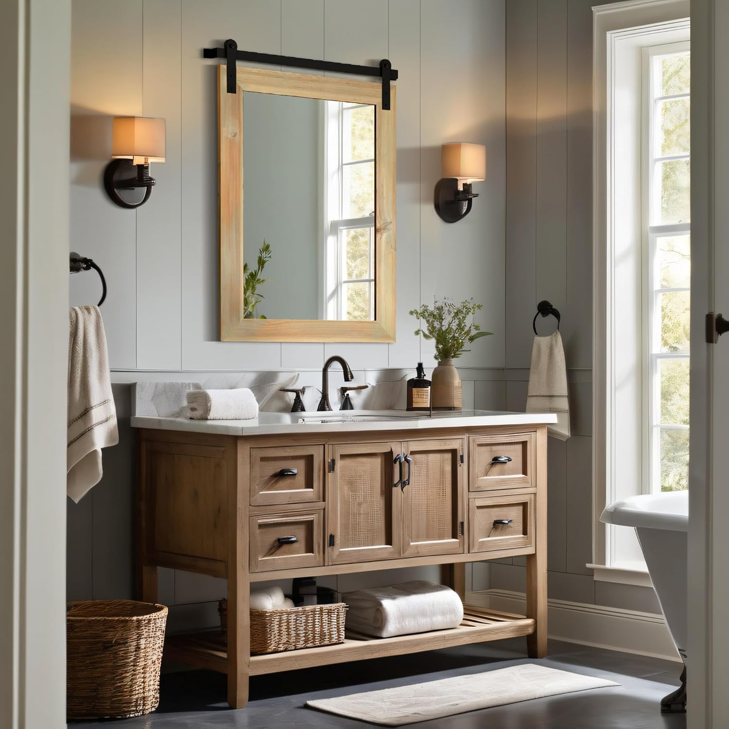 COGOOD Farmhouse Barn Door Mirror - 21" x 30" Rustic Wood Framed Wall Mirror for Bathroom, Living Room, Entryway Wall Decor (Burlywood)