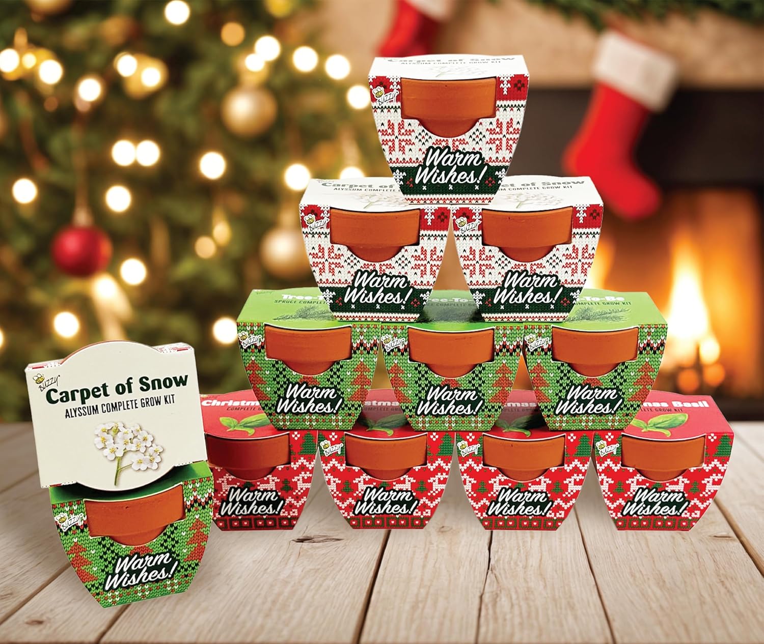 BUZZY Seeds Holiday Mini Terracotta Pots Grow Kit, 12-Pack Assorted Christmas Basil, Spruce, and Alyssum Seed Packets, Indoor Plant Starter Set, Stocking Stuffers, Party Favors