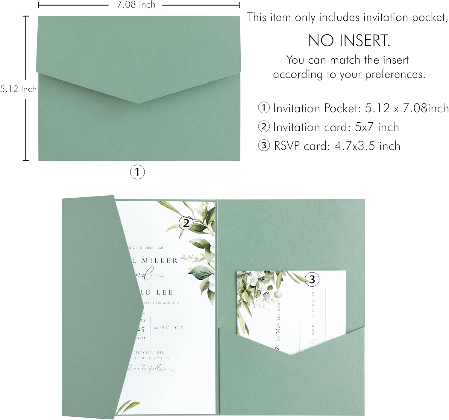 - SIZE -- Invitation pocket 5.12 x 7.1 inch. On the left side of the invitation pocket, you can match the 5x7 inch inner sheets. On the right side of the invitation pocket, you can match detail cards or RSVP cards with a max size of 4.6x7 inner sheets. Envelopes not include. (Please ensure your envelopes is large than 5.31x 7.5 inches, order A8, A9 size envelopes is large enough )