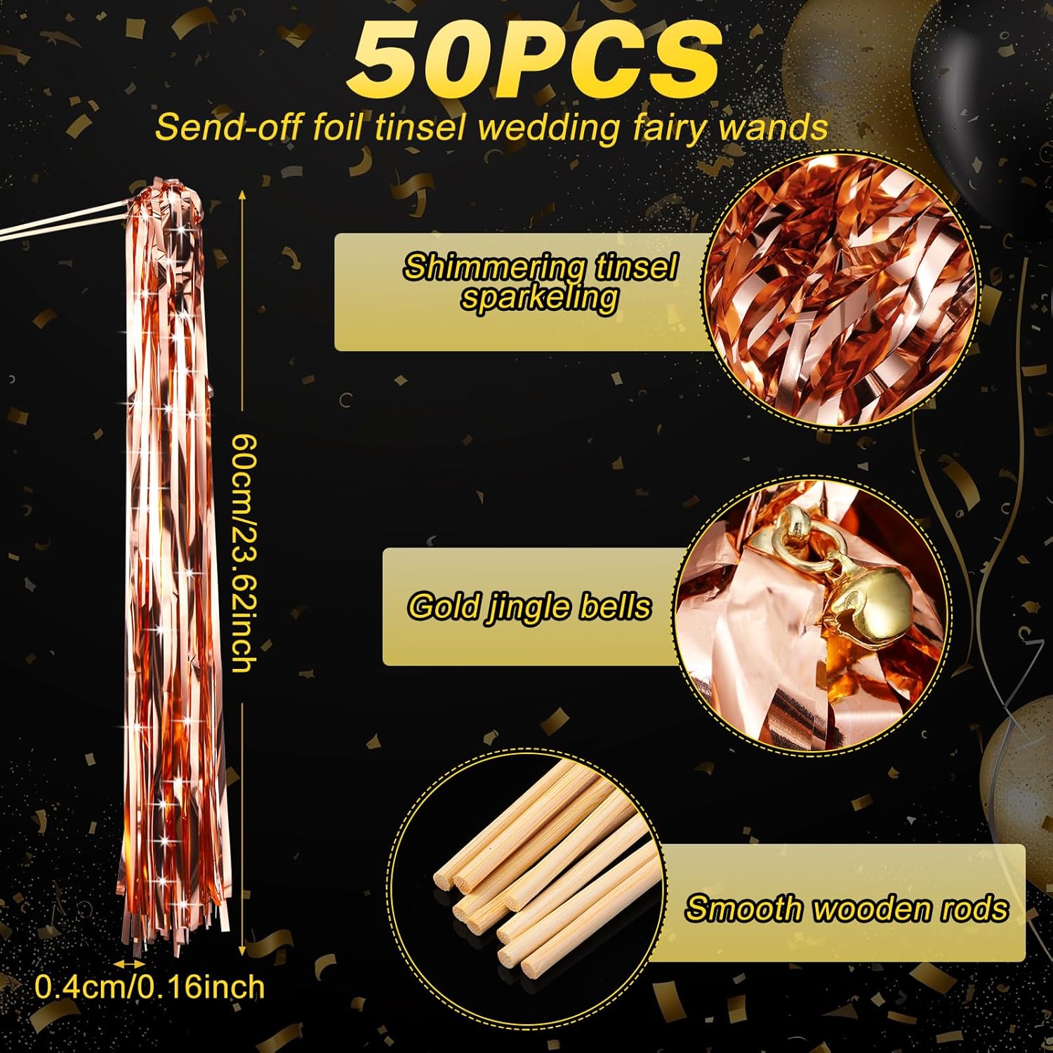 50 Pcs Wedding Fairy Wands with Bells Foil Tinsel Ribbon Stick Wands Tinsel Party Streamers with Bell Glittery Bridal Wedding Send Off Ideas Holiday Celebration (Rose Gold)