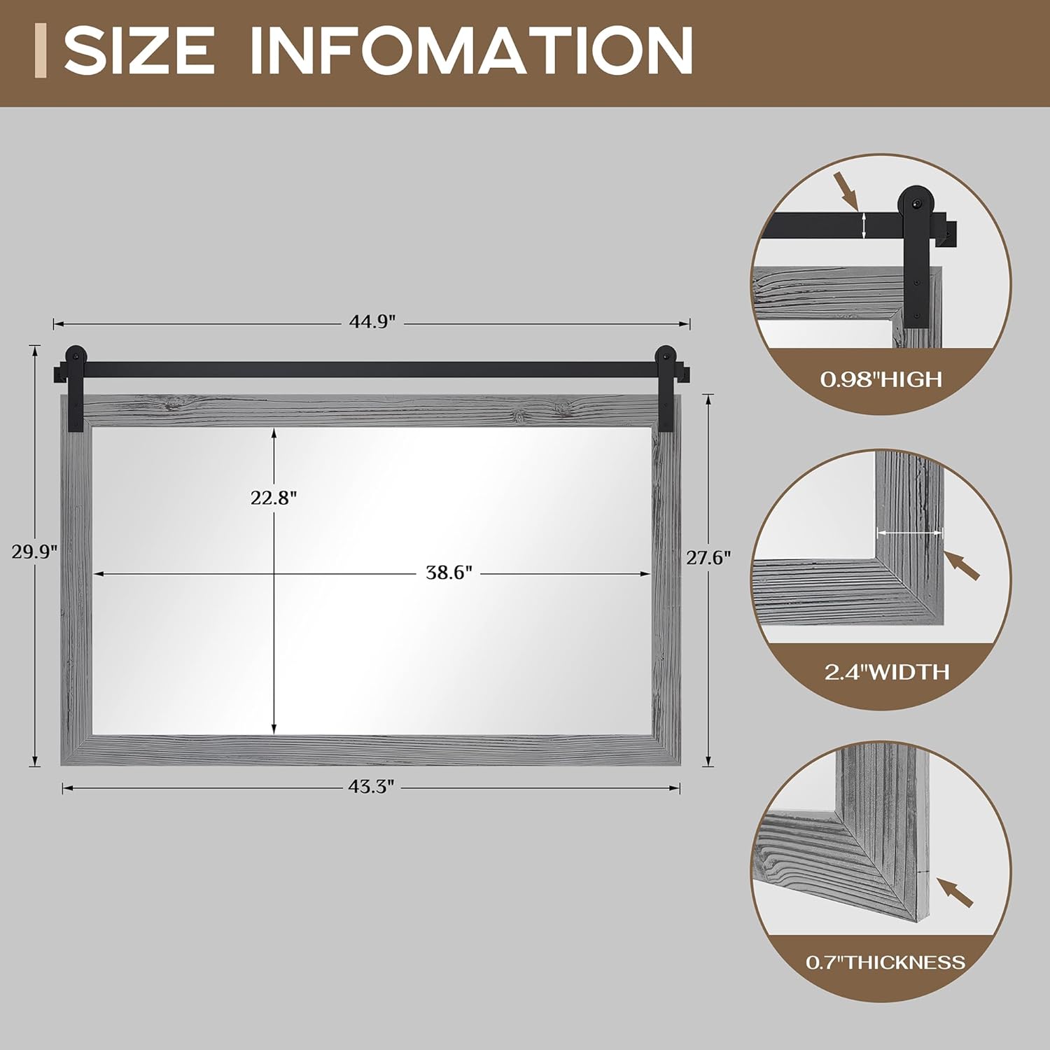 - EASY TO INSTALL: The overall size of this rustic mirror is 44.9 x 29.9 x 0.7 inch, and the display size of the mirror is 38.6 x 22.8 inch. The track is 45 inch. You can first fix the iron bracket on the mirror, then install the track on the wall, and finally the wheels on the iron bracket will be stuck into the track to complete the hanging