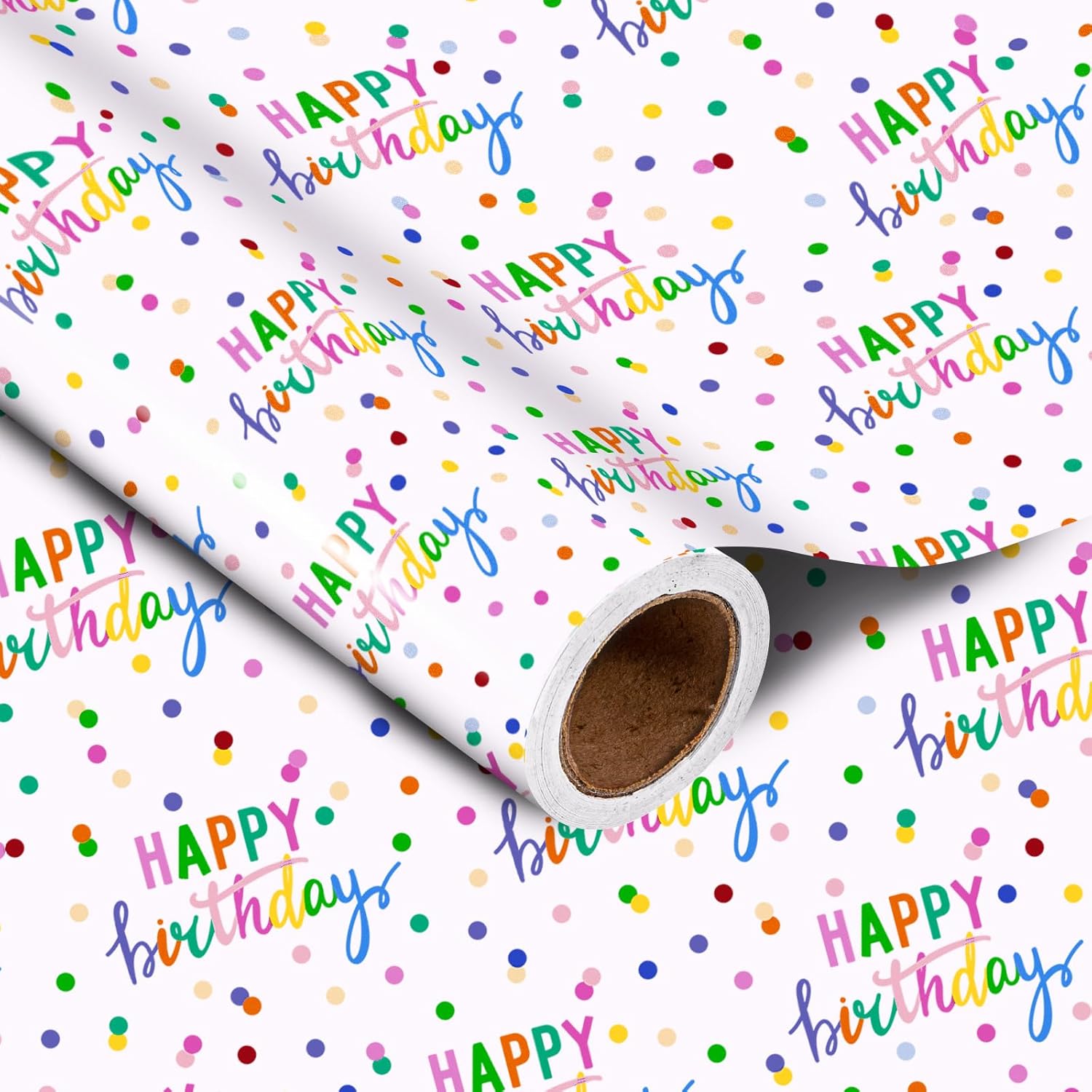 LeZakaa Birthday Wrapping Paper Roll, Happy Birthday Lettering & Colored Polka Dots Design in White for Holiday, Party, Baby Shower, 17 inches x 32.8 Feet (46.45 sq.ft.)