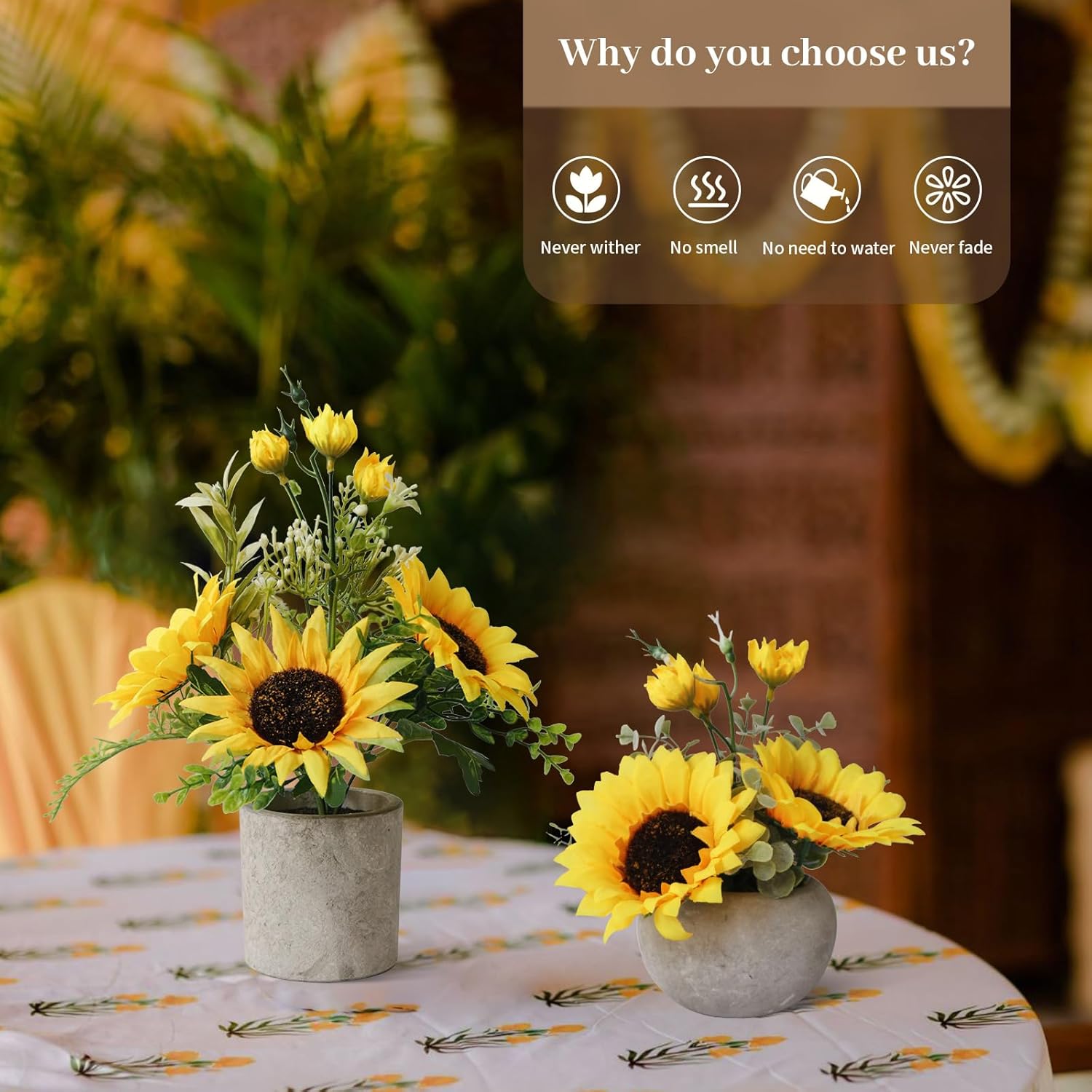 - Package:2 Pcs Sunflowers artificial flowers pot set includes 5 pcs fake flowers,Some small flowers,Plants and eucalyptus for sunflower kitchen decor;sunflower bathroom decor;summer decorations for home;yellow decor