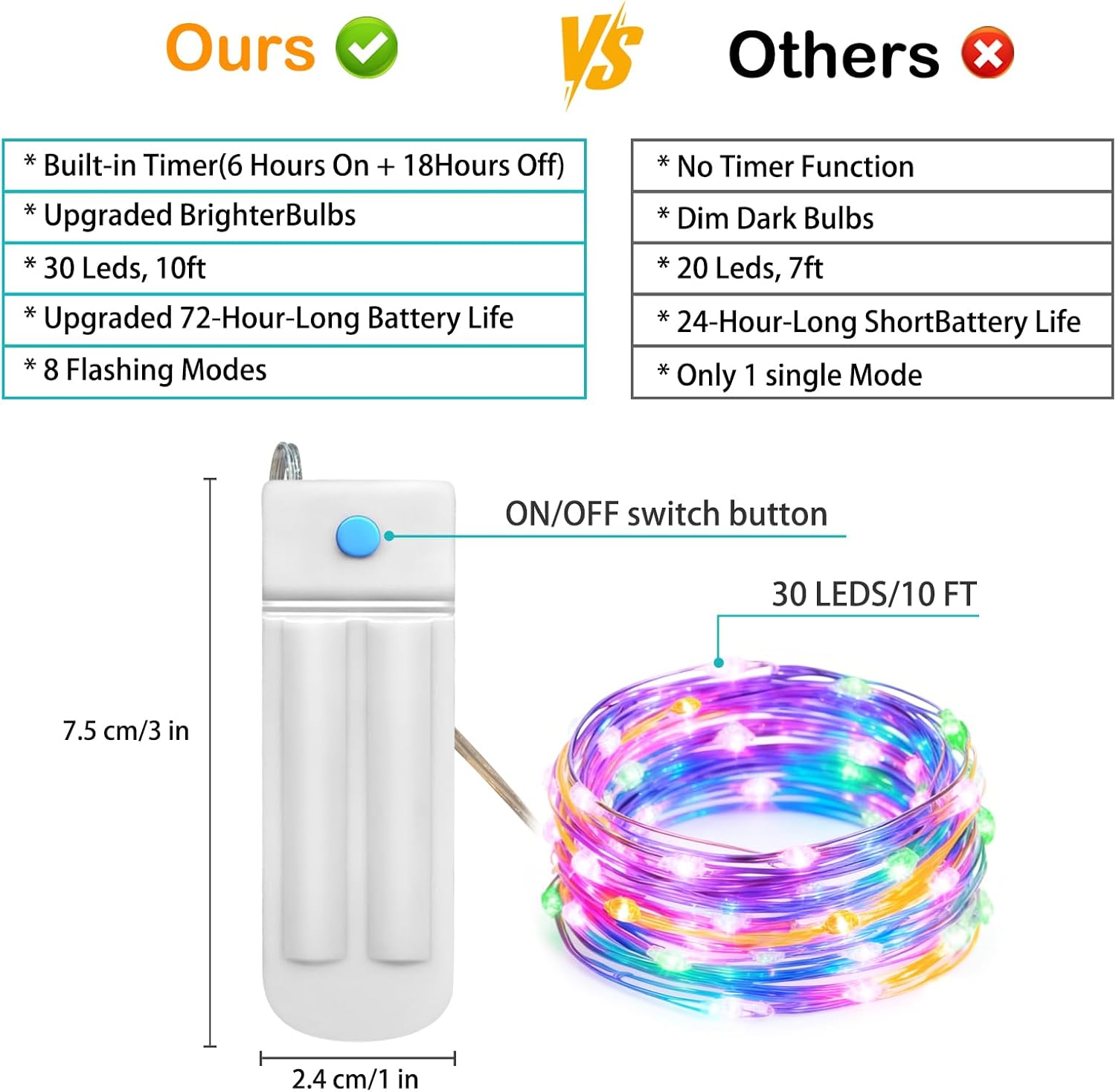 - Fairy Lights Battery Operated With Timer: Christmas string lights are battery operated (batteries included). LED fairy lights are equipped with a convenient timer function. When the switch is turned on, the lights stay on for 6 hours, go off after 6 hours, come on after 18 hours. Our LED lights have 8 lighting modes: steady on, slow on, flicker, slow dark, wave, sequence, chase, combination
