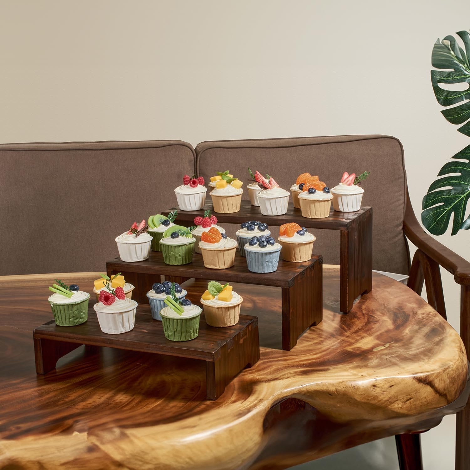 - COMPLETE DISPLAY SET: This 3-piece wooden tiered cupcake display stand set includes 3 distinct sizes—Large: 15.75 x 6.69 x 6.89 inches, Medium: 14.17 x 6.69 x 4.92 inches, and Small: 12.6 x 6.69 x 2.95 inches. These varying dimensions provide a versatile and elegant solution for showcasing your cakes, cupcakes, and desserts at any event