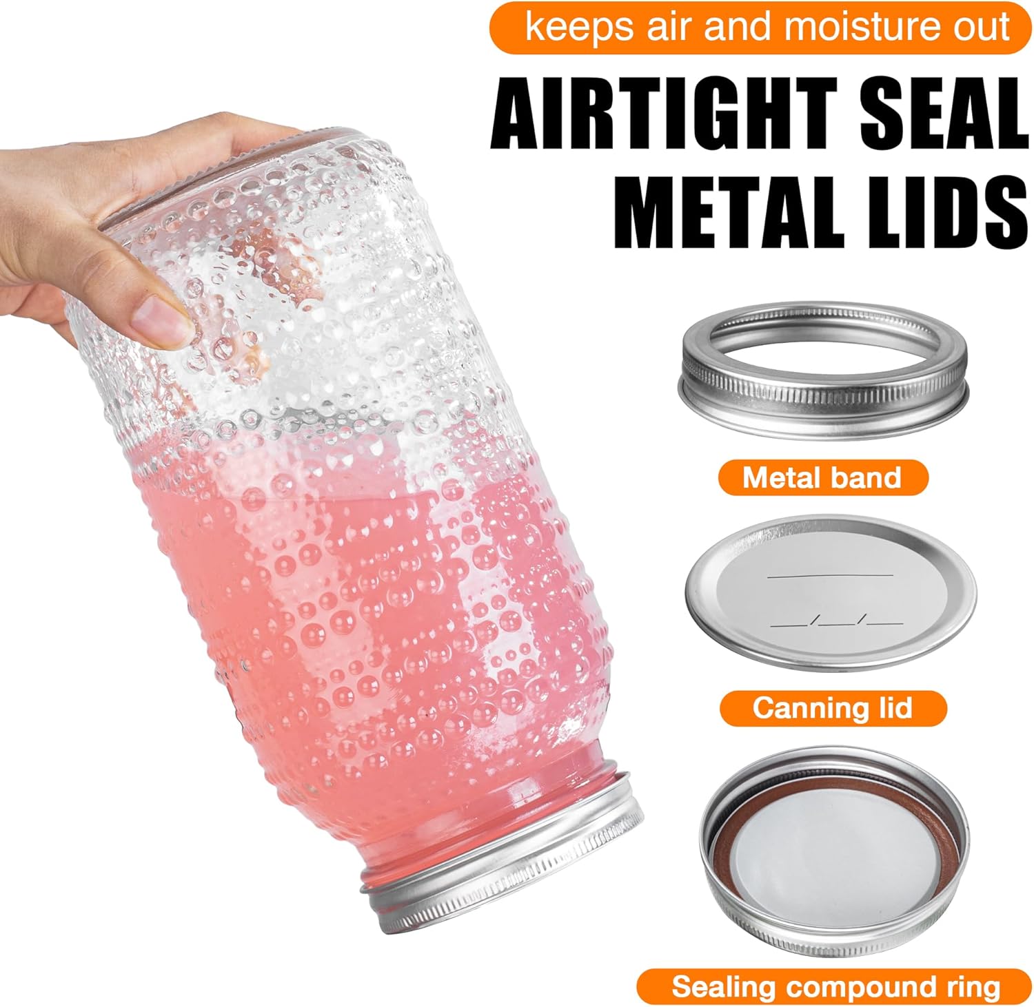 - AIRTIGHT SEAL - The split lid on large mason jars consists of a metal canning lid and band, 64 oz mason jars metal band with an airtight composite ring. The two-layer airtight lid ensures glass mason jars don't leak, insulates against air and moisture, extends the shelf life of the mason jars wide mouth contents, and maintains freshness and flavor.