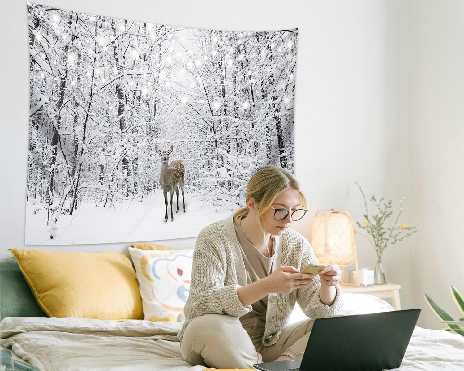 QGHOT Winter Tapestry Wall Hanging Snow Scene Backdrop Winter Wonderland Wall Decor Snowy Forest Wall Art Nature Woodland Deer Tapestry for Bedroom Room Dorm Party Decoration, Large