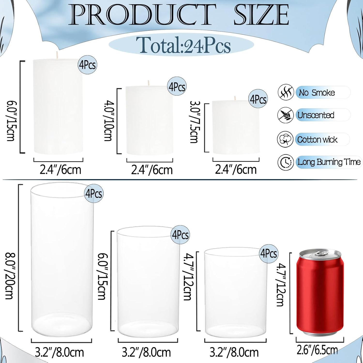 UDU 24 Pcs White Pillar Candles and Glass Cylinder Vases, Hurricane Pillar Candle Holder Vases for Wedding Centerpieces Table Party Home Decor(3.2" X 4.7", 6", 8")