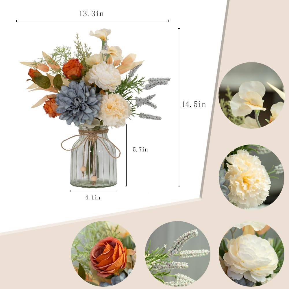 - SIZE DETAIL: The faux flowers with vase, total measured 11"x 14.9", clear glass vase size is 5.7" x 4",Please read the measurement more attentively before order.