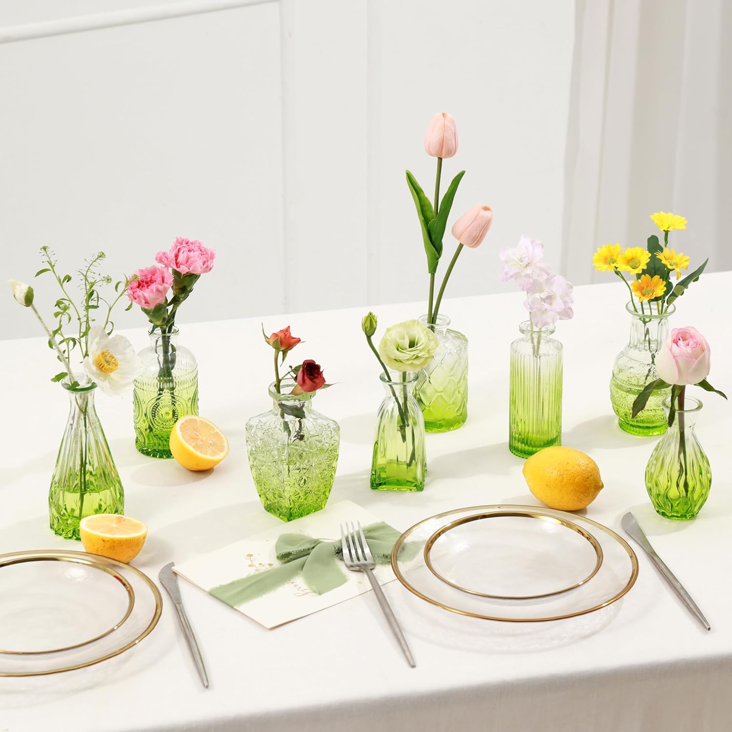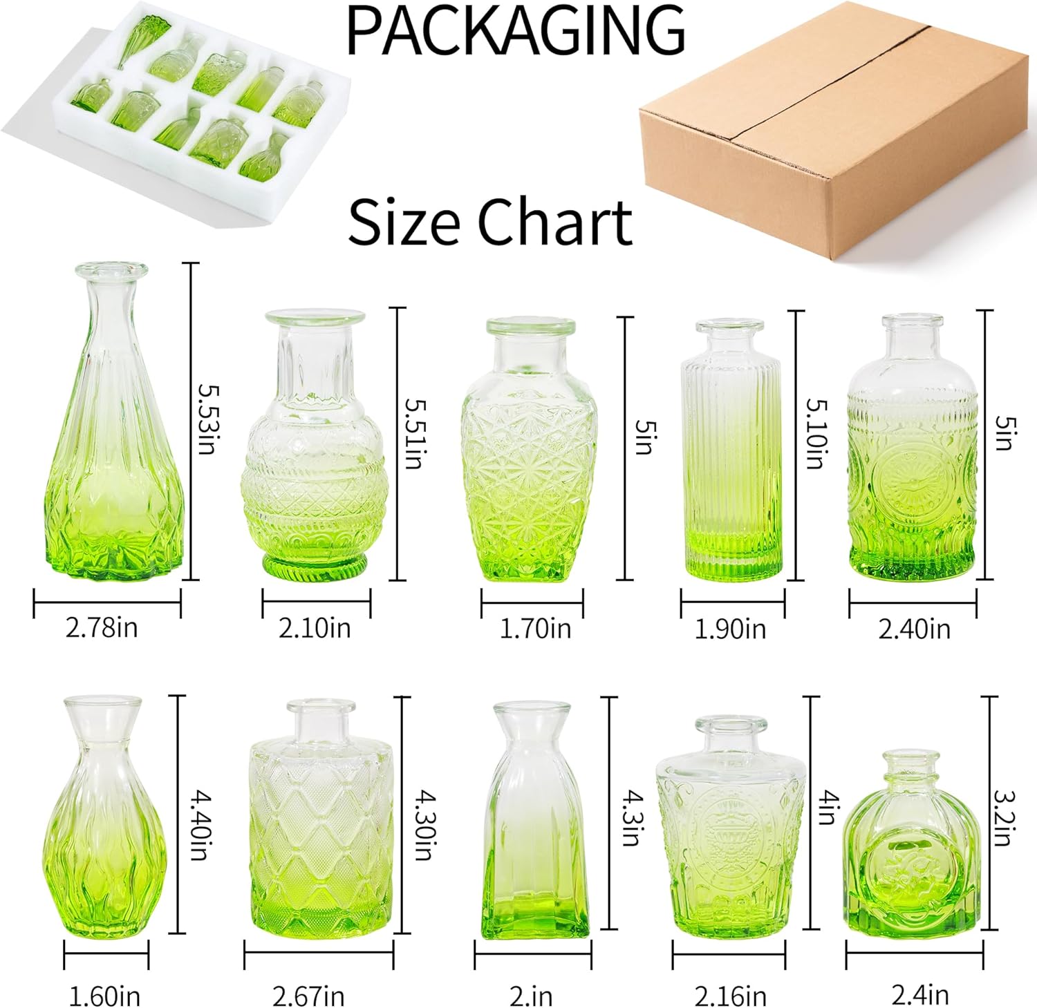 - SPECIAL DESIGN: The small vases for flowers set of 10, Each vase is literally decorated with special etching patterns to further enhance its look. They are graceful and can be used for any occasion, from elegant to classic casual. They will make a great decorative highlight on your window sill, on your dining table or as a wedding centrepiece.
