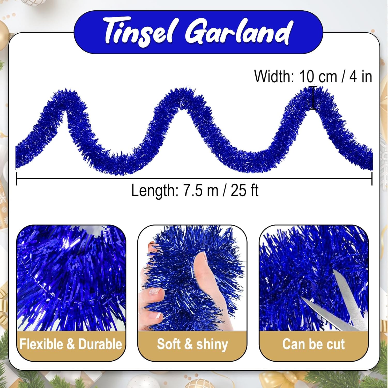 - Package and Size: Package comes with 1 piece Christmas tinsel garland, approx 7.5m/ 25 feet in length and 4 inches in width, which is long enough for your decoration needs. The abundant length is convenient for you to cut them in most length you want, to decorate your Christmas tree in your own style