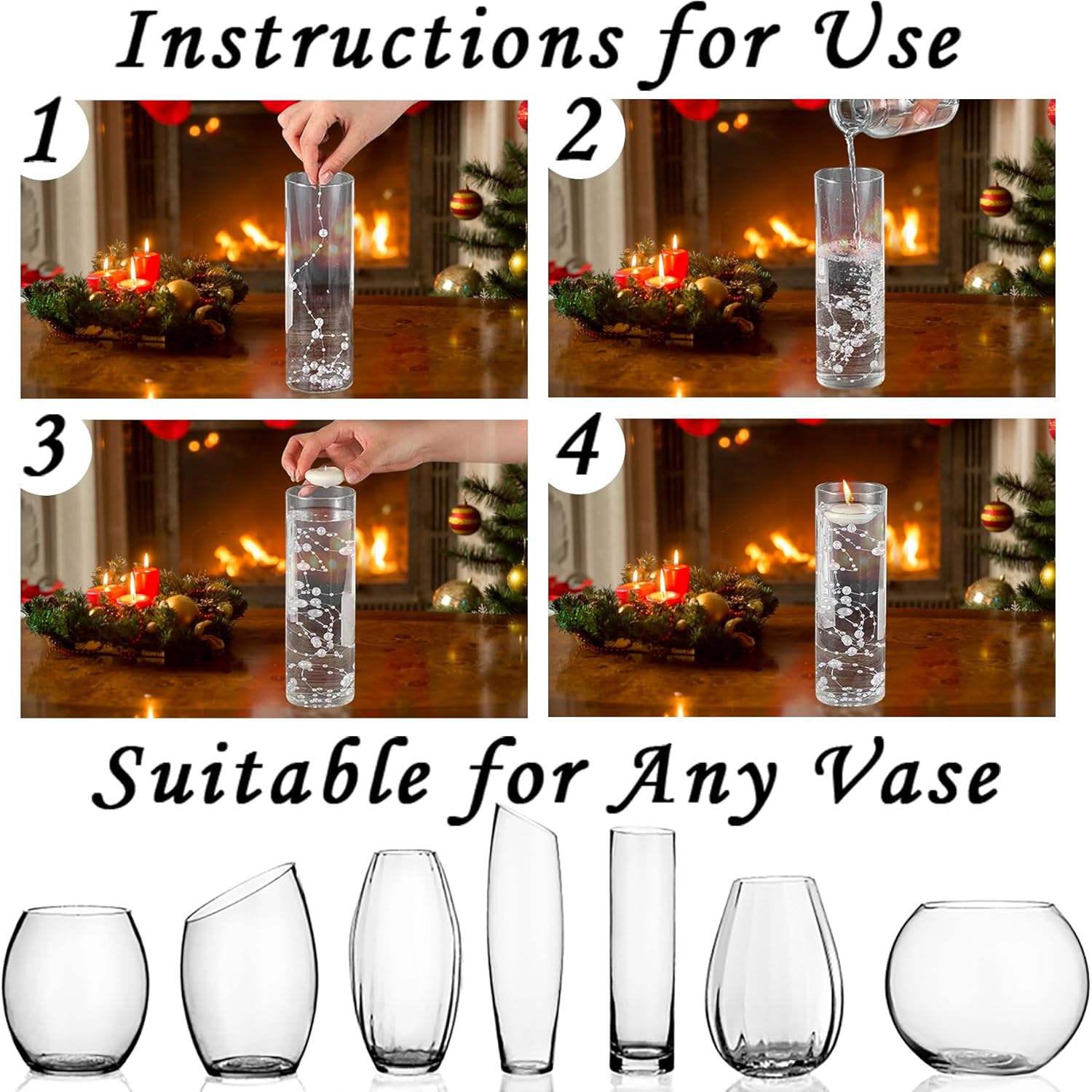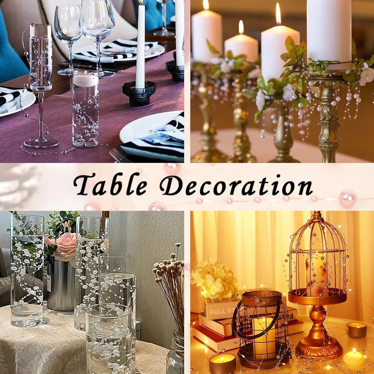 - Pearl String Beads: These artificial fake pearls strands are designed for floating candles, easy to use, just fill the string beads into the floating candle glass candle holders; you can also fill the vase with water and add 2 or 3 strands of beads string, which will make the centerpiece more romantic and gorgeous, for tall or large vases, just fill it with more strands of pearl decorations to bring a rich and luxurious look to your precious vase filler